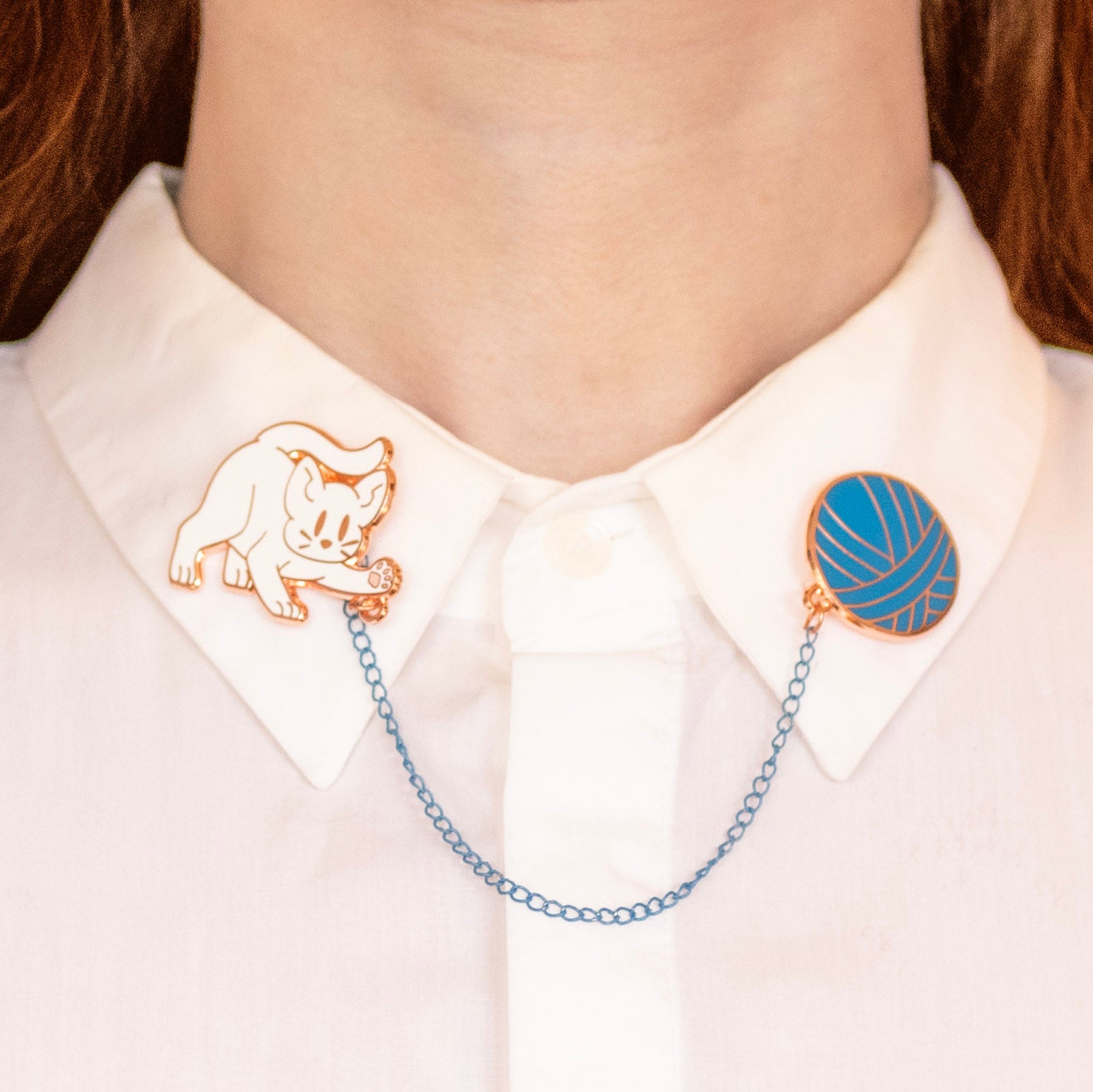 Y'know, like nya! These adorable kittens are ready to chase yarn across your lapels! Featuring the smallest of toe beans and ~15cm of chain, these sets sit perfectly on collared shirts. Each pin has one back clasp for easy attachment to collars.