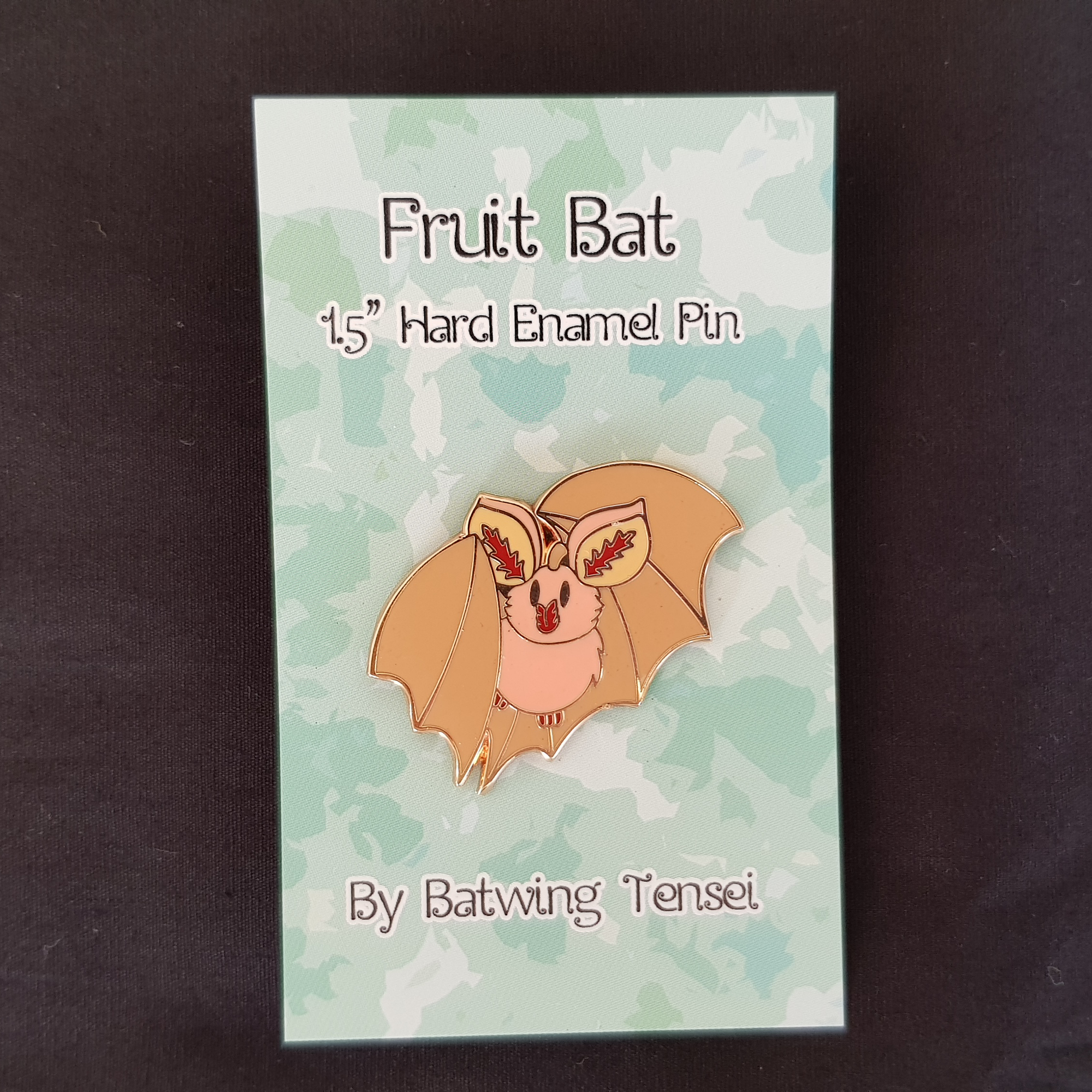 Fruit bats, literally! These bats are based on peaches, with their ears being cross sections of the fruit! Each pin has two back clasps so it stays securely on your bag, clothes or pin board.
