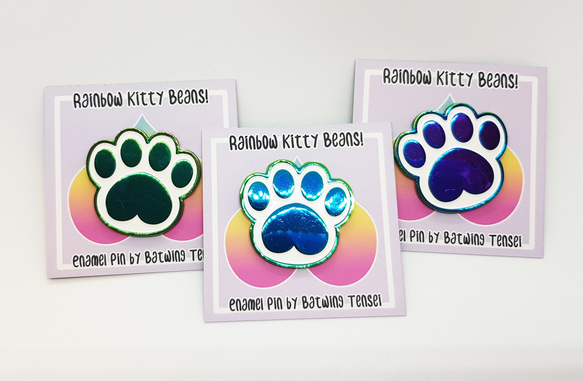Show your love for kitty (or puppy) toe beans with these adorable rainbow pins! These soft enamel pins change colour as they move, ranging from deep blues to light greens. Each pin has one back clasp.