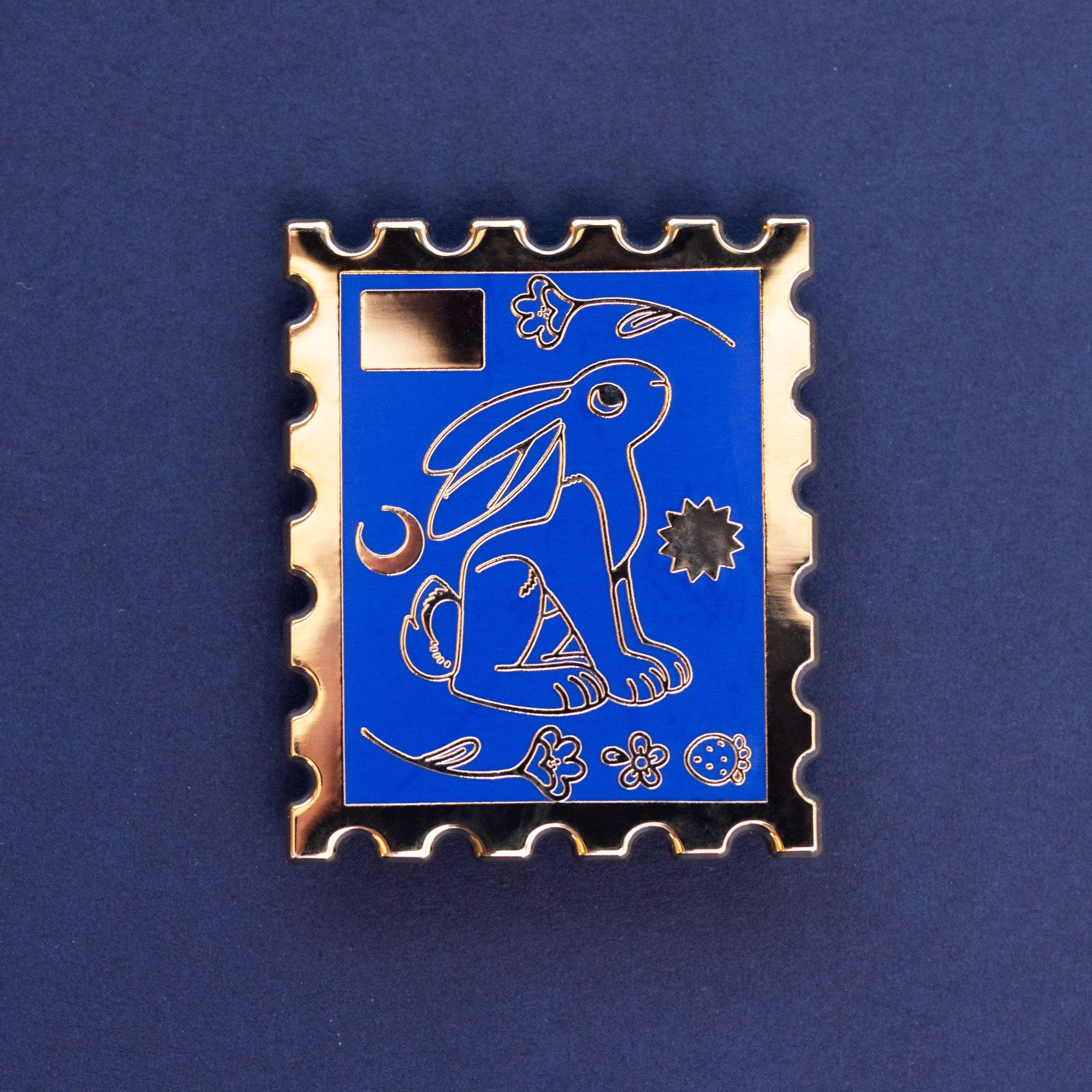 Show off your fun style with this cute enamel pin featuring a bunny and stamp design. Crafted with gold and blue enamel, this pin is the perfect accessory to add a touch of flair to your outfit.