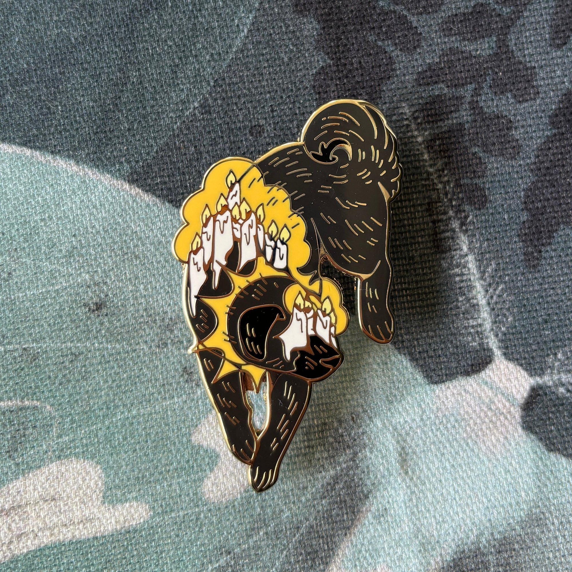 This pin is approximately 2 in (5 cm) long. The pin has hard enamel, gold plating, and two pin posts with rubber clutches. This listing is for standard grade pins only. Standard grade pins may have one or two tiny imperfections.