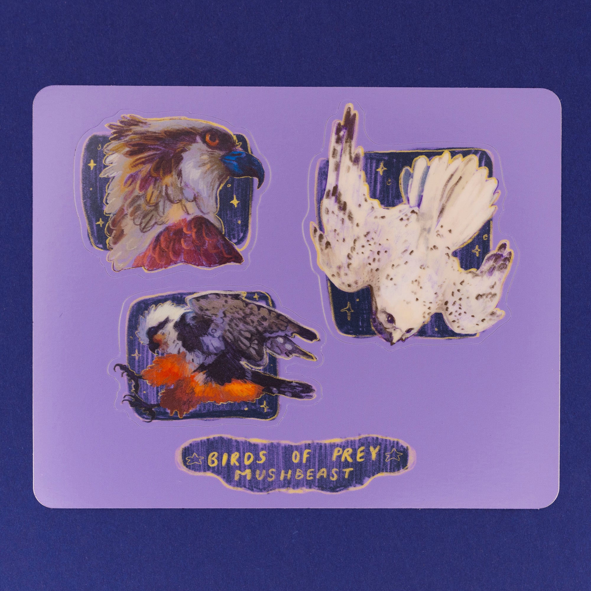 ⁂ birds of prey ⁂ ft. an osprey, gyrfalcon & falconet. 5 x 4" with 3 stickers. suitable for long term outdoor use & dishwasher safe!printed with ♻️ eco-friendly inks.