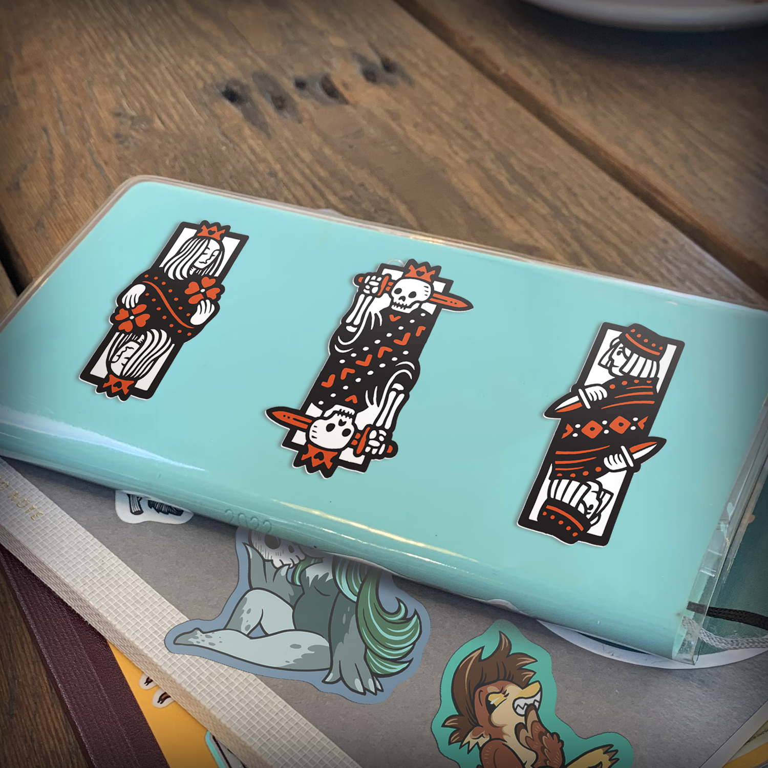 A small set of designs based off of some famous face cards; The Suicide King, The Queen of Hearts, and the One-Eyed Jack