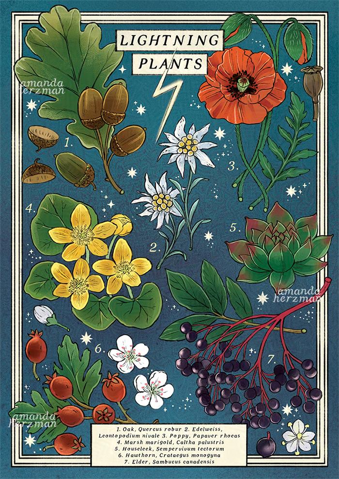 Associated with lightning lore, these fascinating trees and plants both attract and repel lightning in myth and folklore. This print lists  the common names and scientific names and is A5 in size (14.8 x 21 cm).