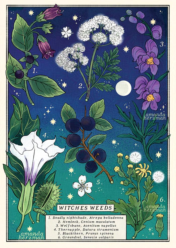 Associated with the history of witches, these plants and weeds are deadly specimens that have long histories in our myths and folklore. Used in poisonings, potion brews and spells, these plants have intriguing pasts! This print lists the common names and scientific names and is A5 in size (14.8 x 21 cm).