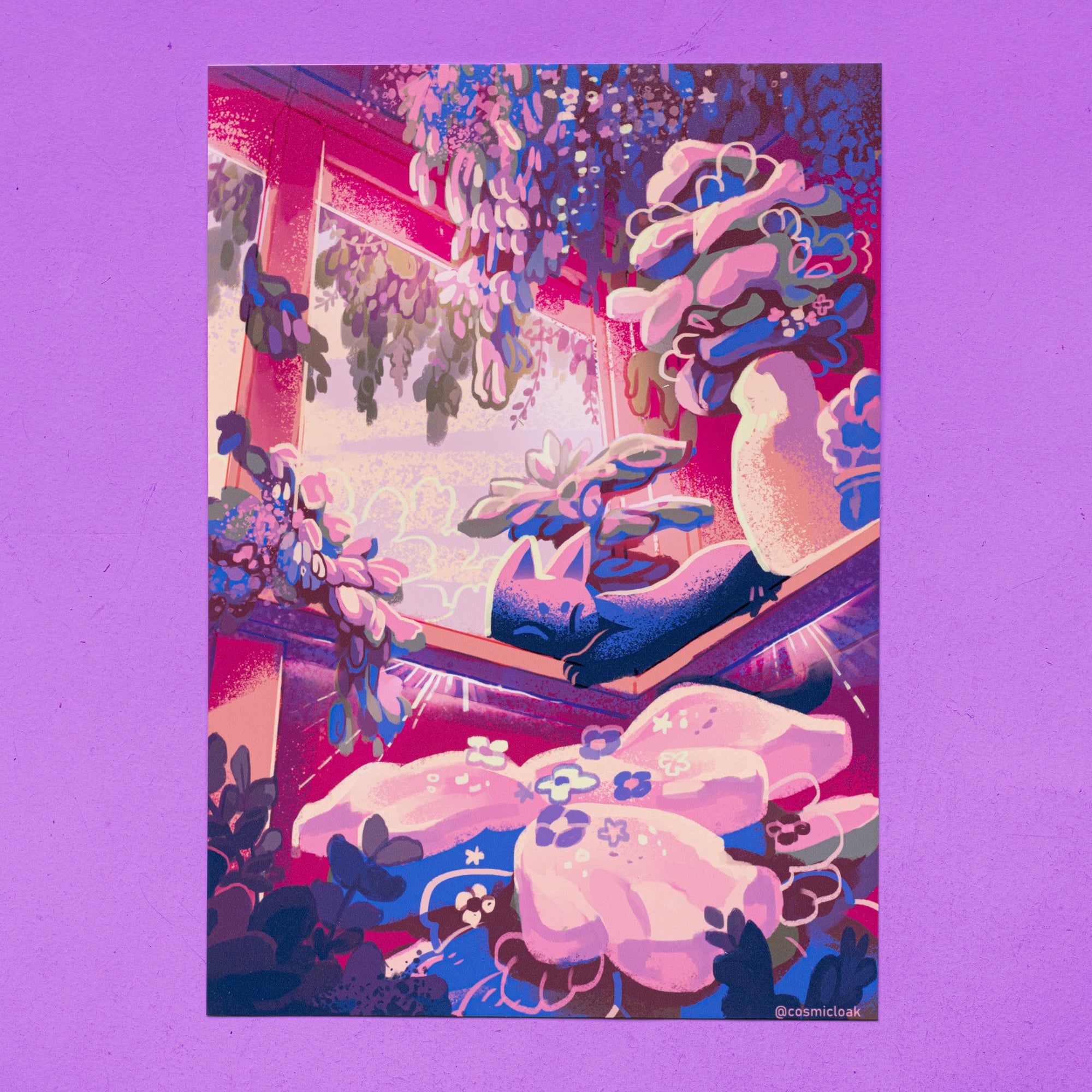 Sleepy cat sunbathing next to a garden window. Printed on Satin 260gms paper.