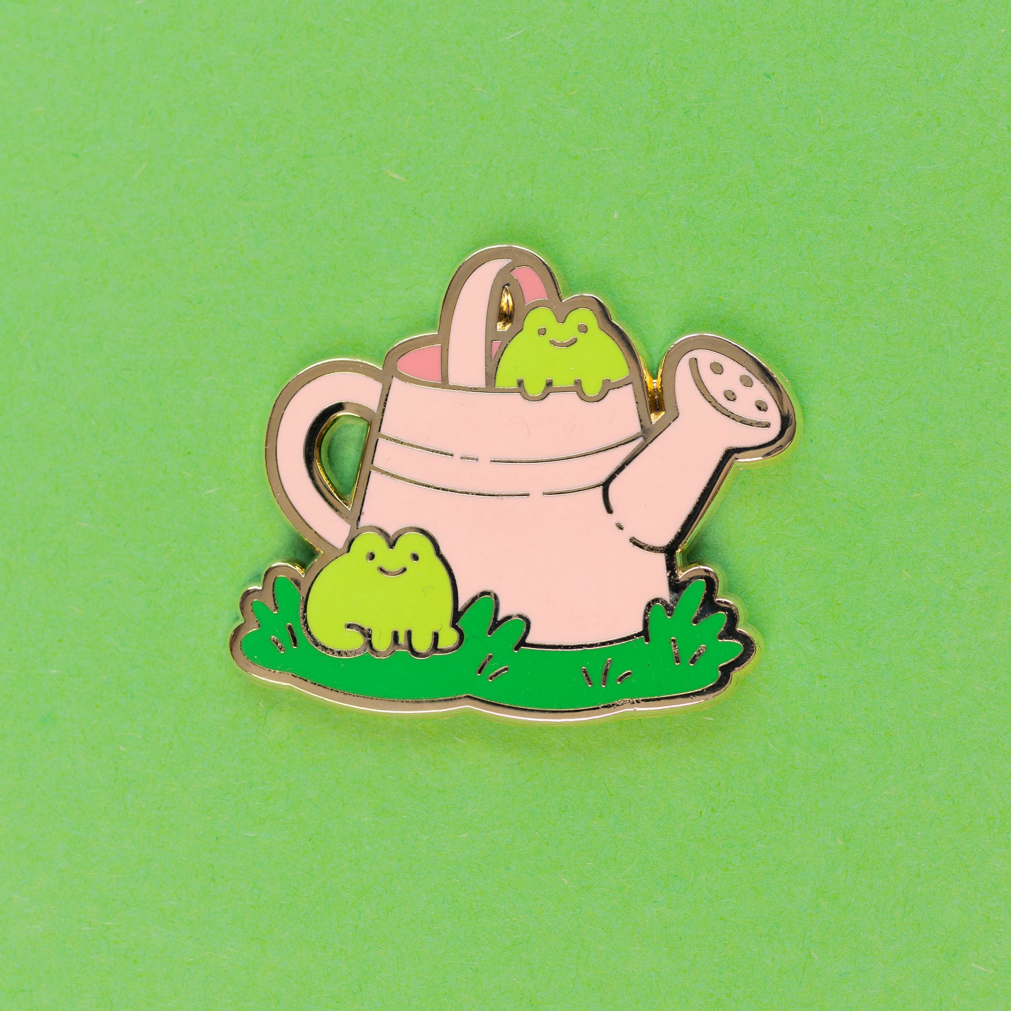 This adorable frog watering can pin is made from hard enamel and measures 1.5" wide. Perfect for decorating your jacket, hat, backpack, and more!