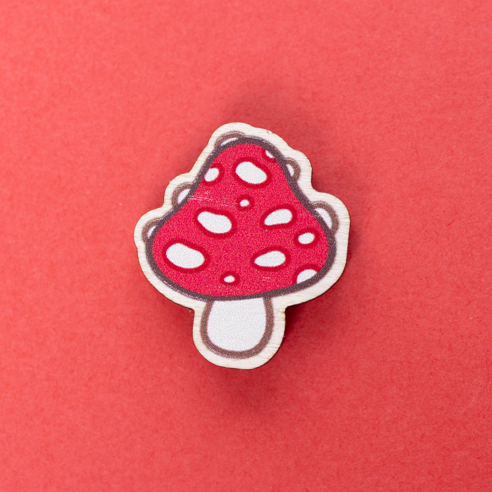 This mushroom mini wood pin is maple wood with a matte finish. They measure about 1โ tall and have a pink rubber clutch backing. These are a perfect addition to a pin board or ita bag, or as a cute accent on a jacket or bag!
