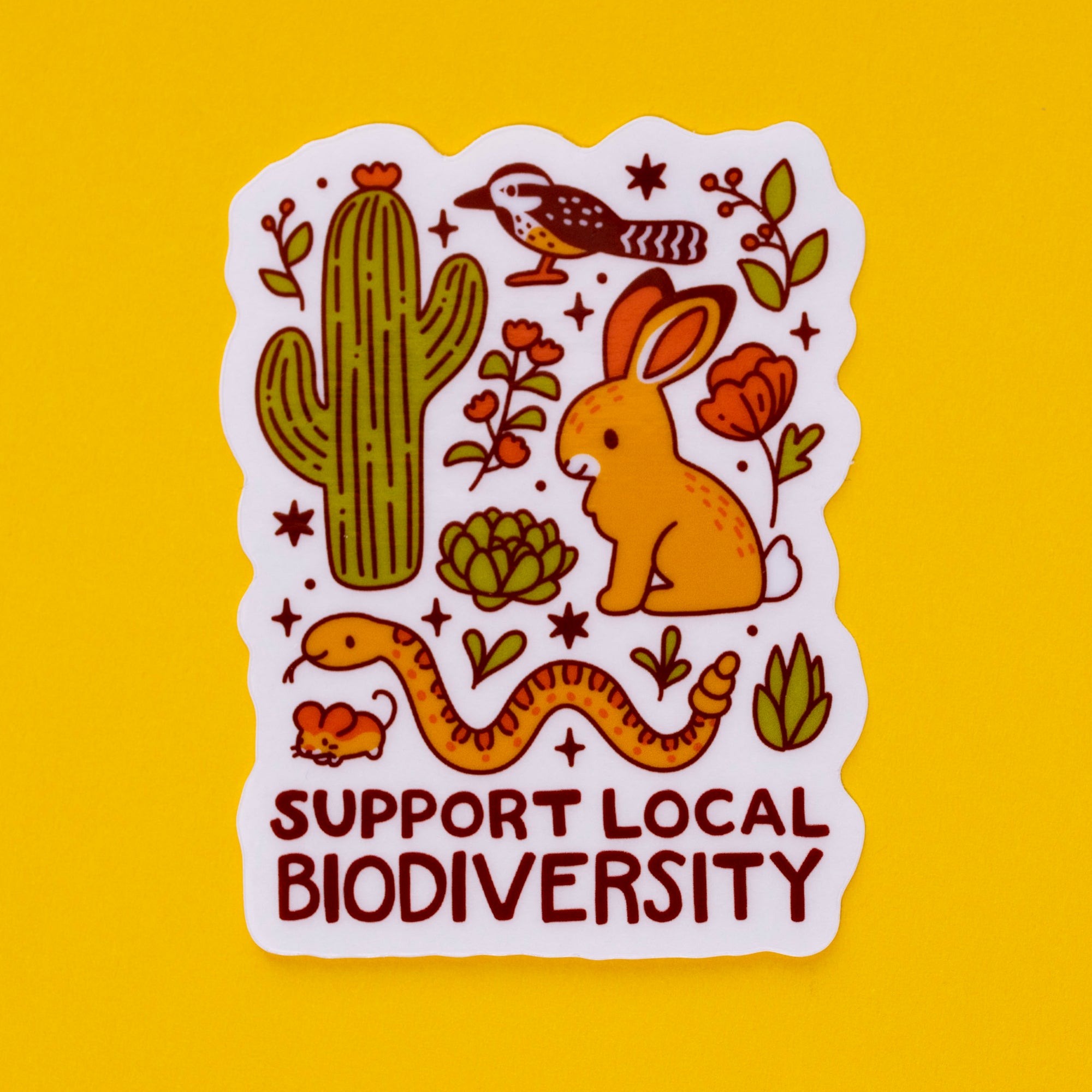 This Support Local Biodiversity sticker is clear, 3โ tall, and has a glossy finish. It features local Southern California Wildlife. These stickers are perfect for decorating your laptop, water bottle, journal, and more!