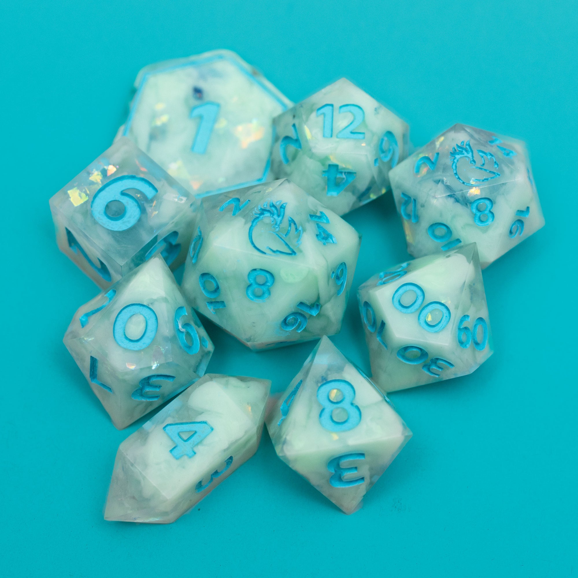 Please Note: All dice are handmade, and as such, may have small imperfections, but will not effect the gameplay nor the rolls of the die itself. I will endeavor to note any marks contained in each set, if they are present.