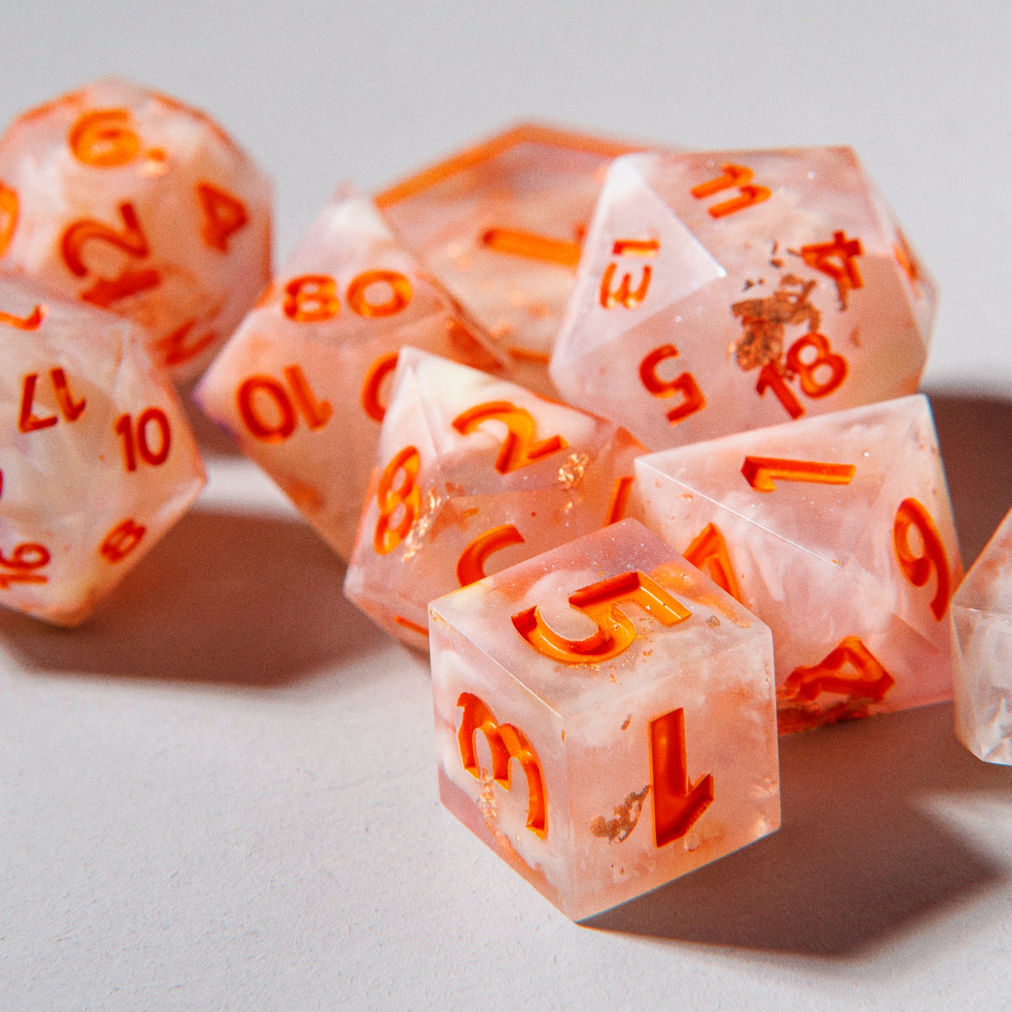 Please Note: All dice are handmade, and as such, may have small imperfections, but will not effect the gameplay nor the rolls of the die itself. I will endeavor to note any marks contained in each set, if they are present.