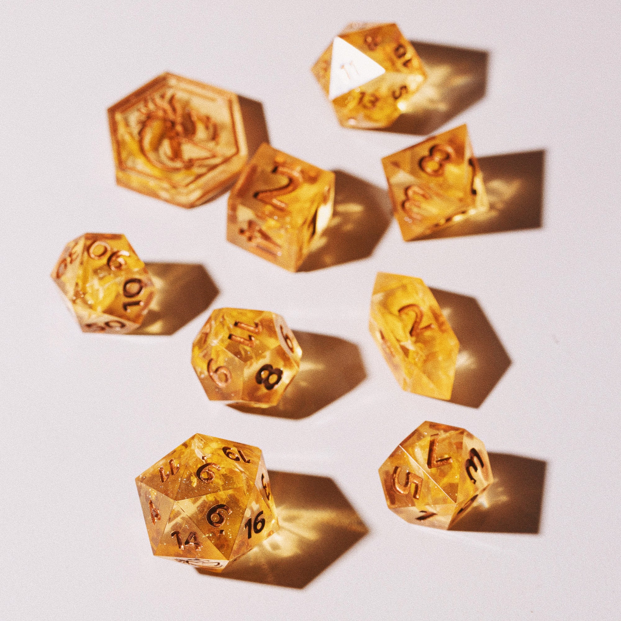 Please Note: All dice are handmade, and as such, may have small imperfections, but will not effect the gameplay nor the rolls of the die itself. I will endeavor to note any marks contained in each set, if they are present.