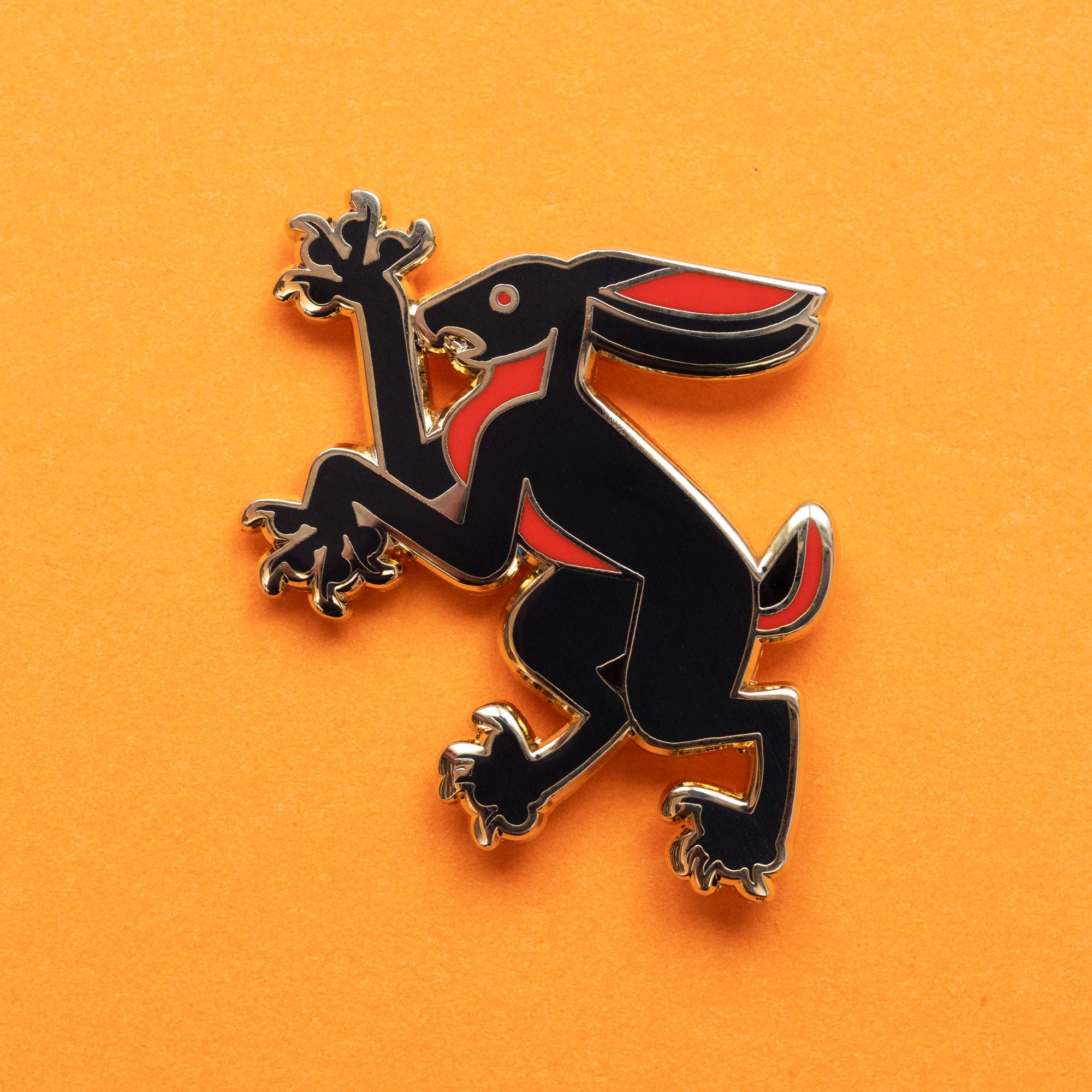 This cute and quippy little Hare is here to bring a pinch of heraldic style to your wardrobe! This gold plated hard enamel pin is perfect for accenting your favorite jacket, bag, hat ... or whatever else you can think of. Hop to it and get your hands on this stylish little critter!