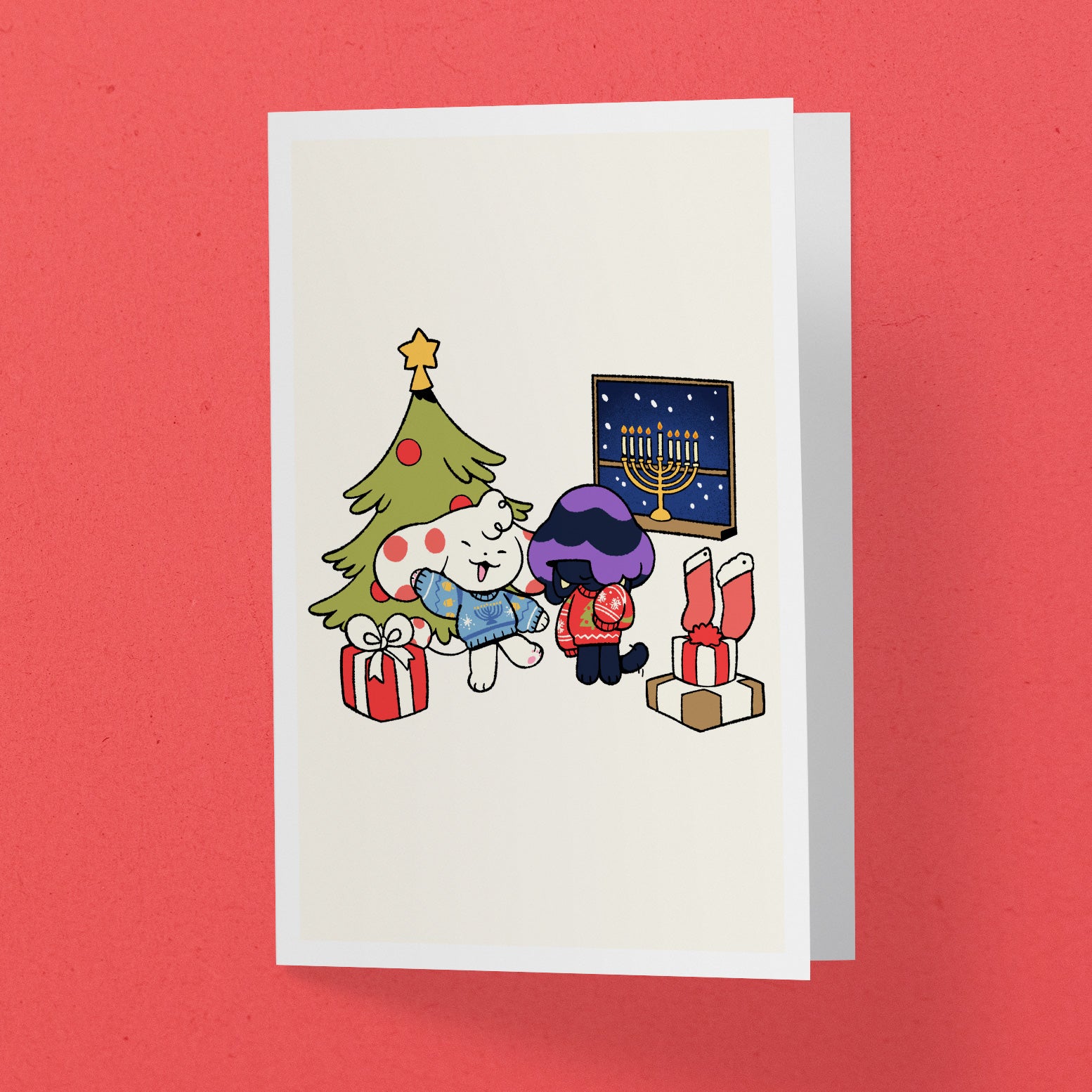 Mushroomy and Inky here to celebrate the Holidays with you! Celebrate Christmas, Chanukah, and the Holidays with this original illustration printed on high quality responsibly sourced card stock. This folded A6 size greeting card comes with an included envelope.