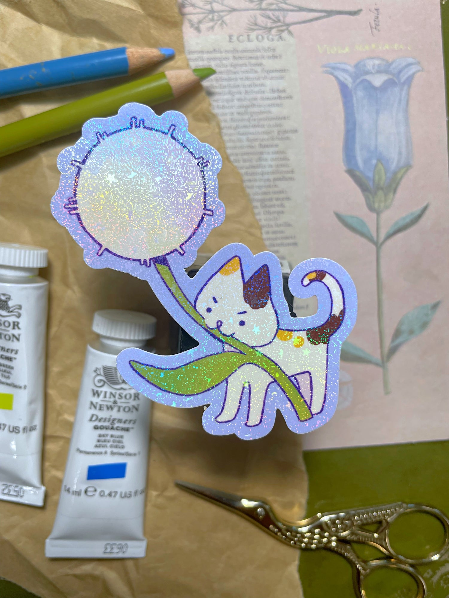 Lil' calico cat carrying a cute dandelion! Printed on high quality vinyl with a sparkly holographic stardust finish. Water proof, UV resistant and dishwasher safe!