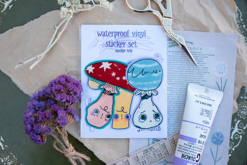A set of THREE funky mushroom stickers, cause they're besties who can't be seperated. Printed on high quality vinyl with a shiny, glossy finish. Water proof, UV resistant and dishwasher safe!