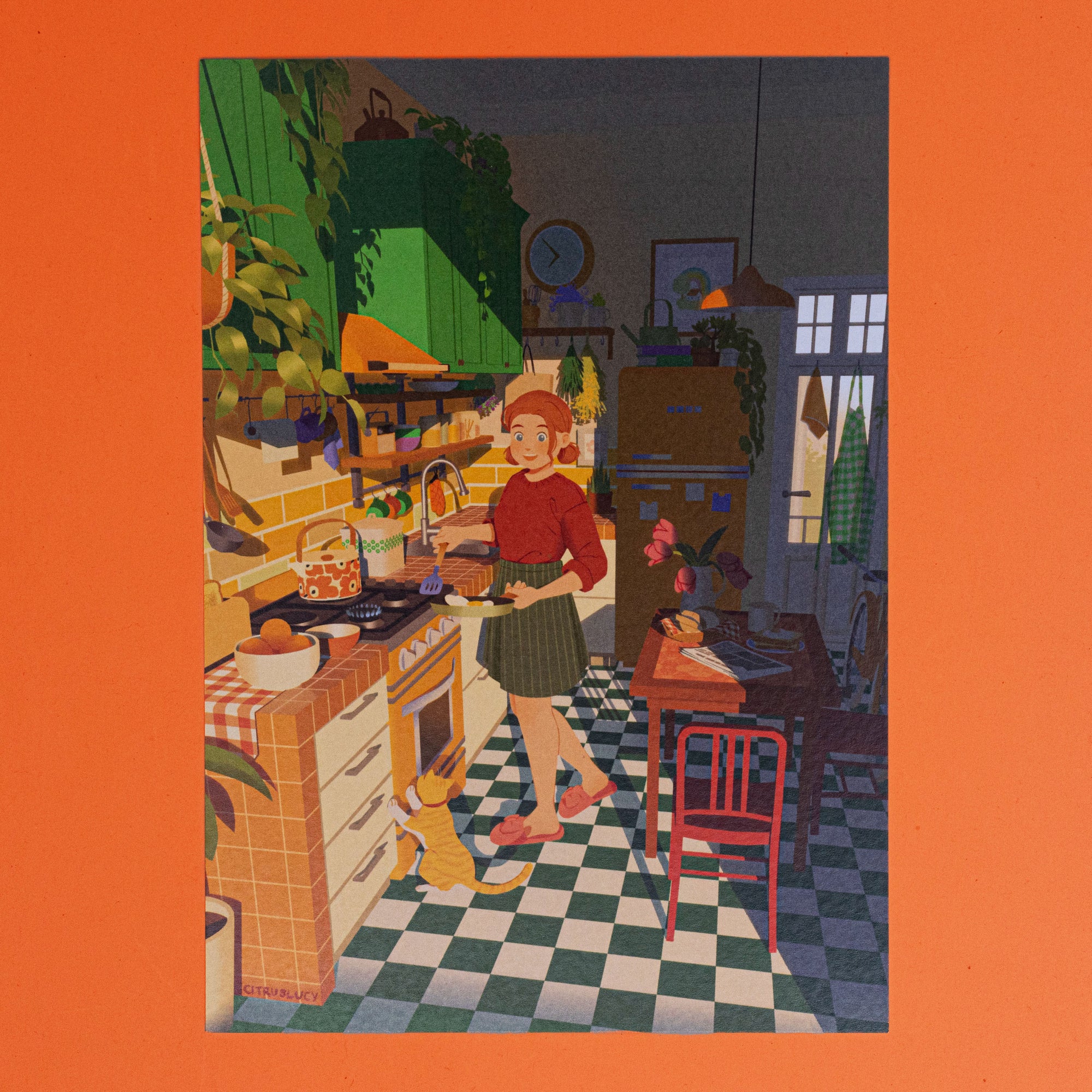 A5 illustrated card stock print by Lucy Zhang. A wonderful sunny morning in the kitchen.