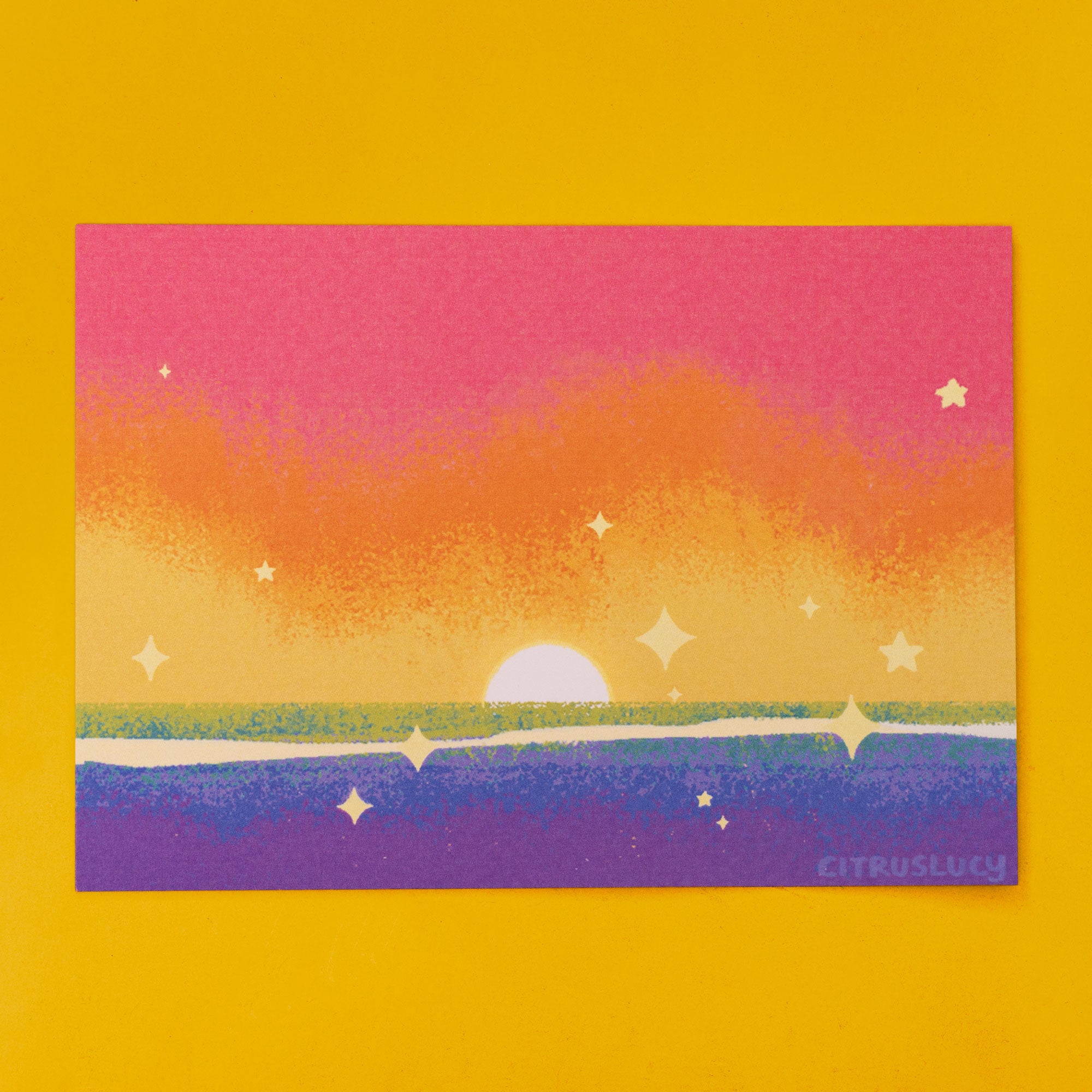 This postcard evokes the rainbow flag through a sparkly ocean landscape.