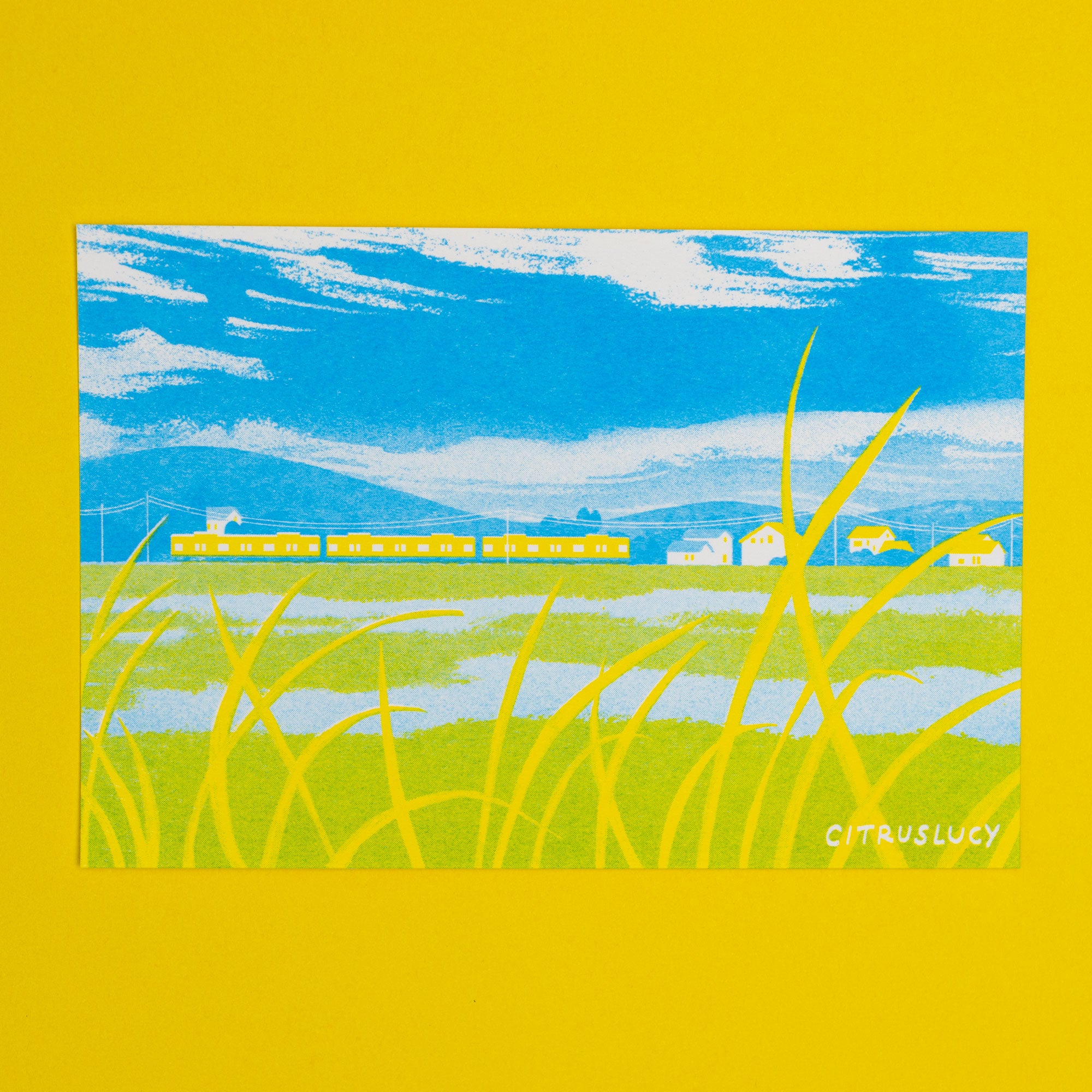The morning train to Itoshima. Two colour risograph postcard, printed in Japan.