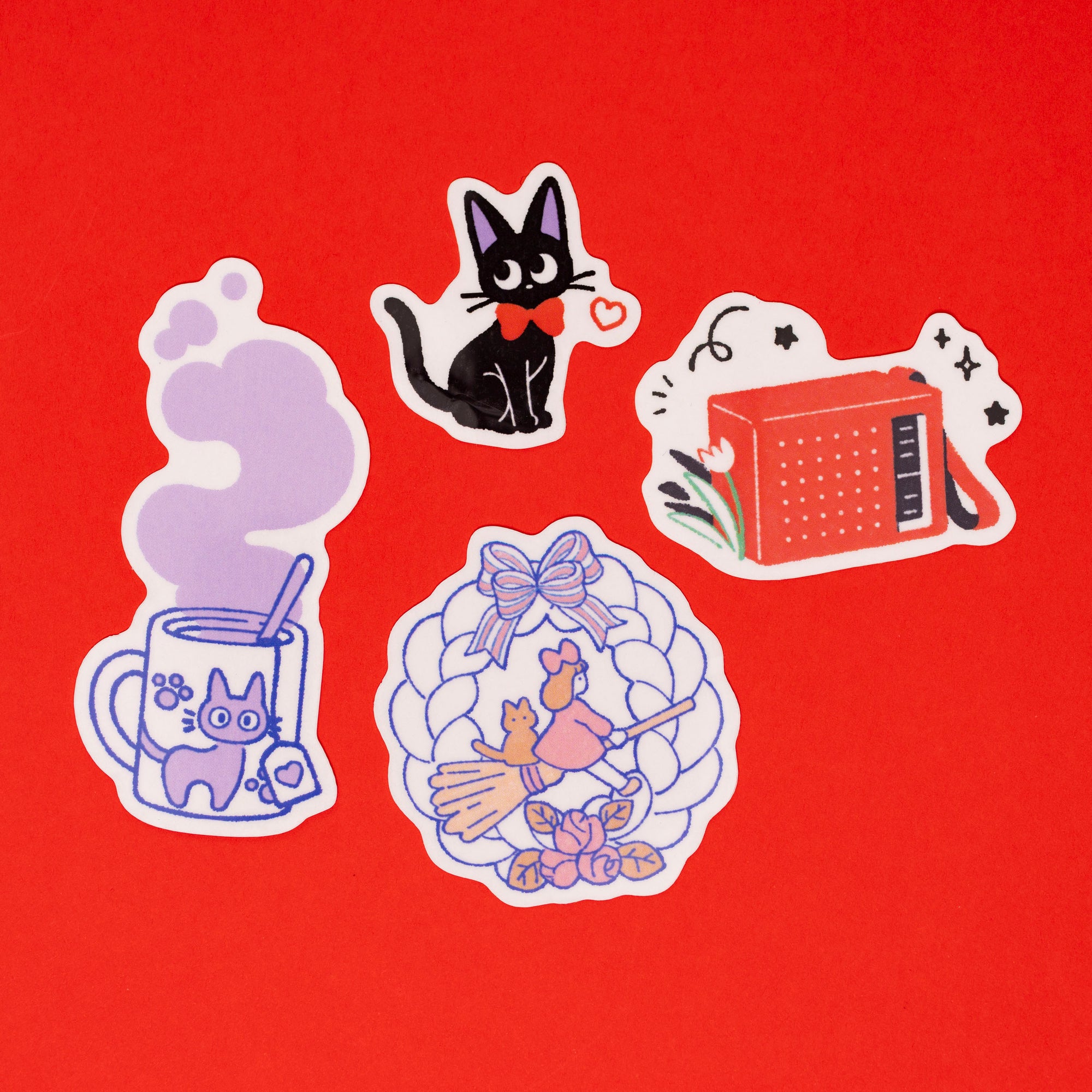 Four-pack of temporary tattoos inspired by Kiki's Delivery Service, approx. 2 inches each.