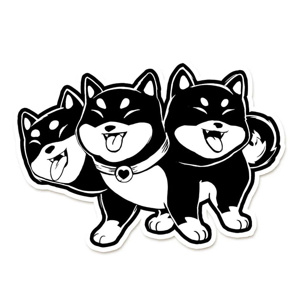 Vinyl sticker of a Cerebus but Shibas!Vinyl stickers are approximately 6 x 8 cm.All vinyl stickers are:WaterproofSun proofDishwasher safeColours may vary depending on your monitor settings.