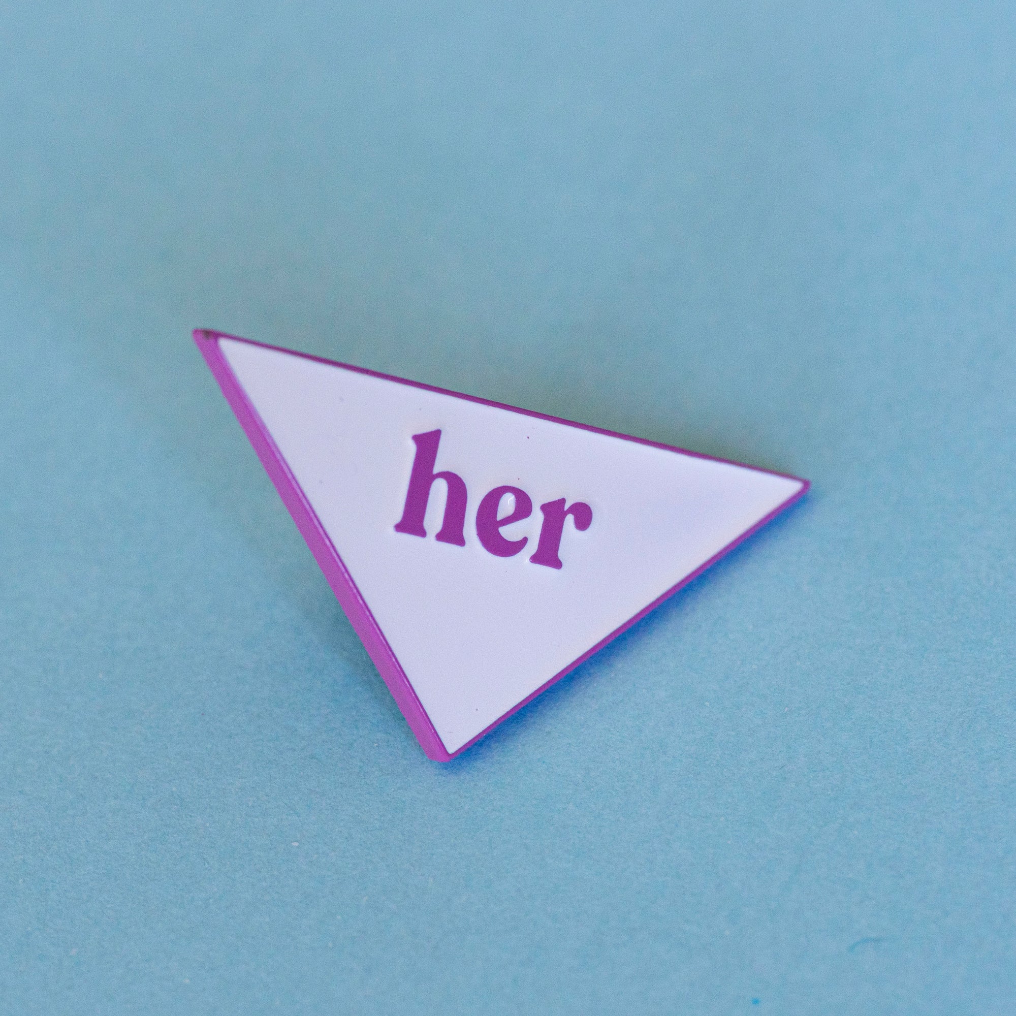 HER! Create your very own custom combination of pronoun pins! Made with Soft Enamel on Pink Coated Iron.