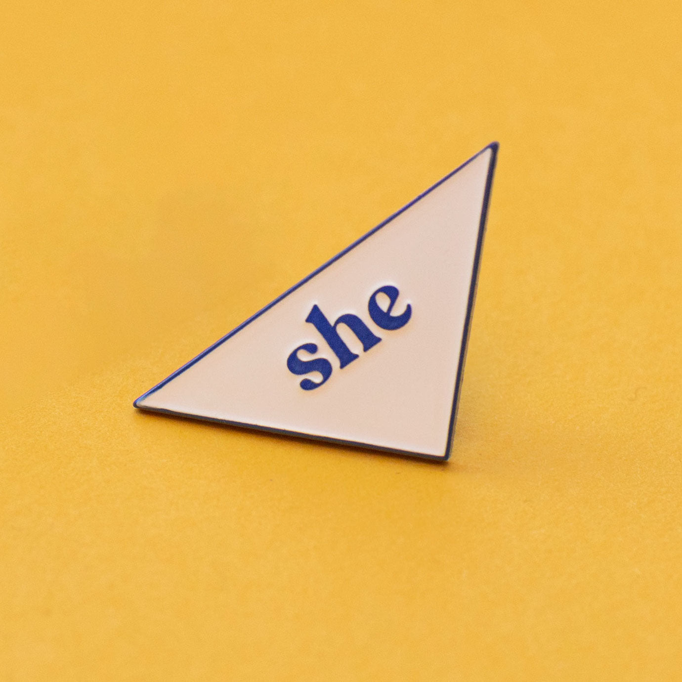 SHE! Create your very own custom combination of pronoun pins! Made with Soft Enamel on Blue Coated Iron.