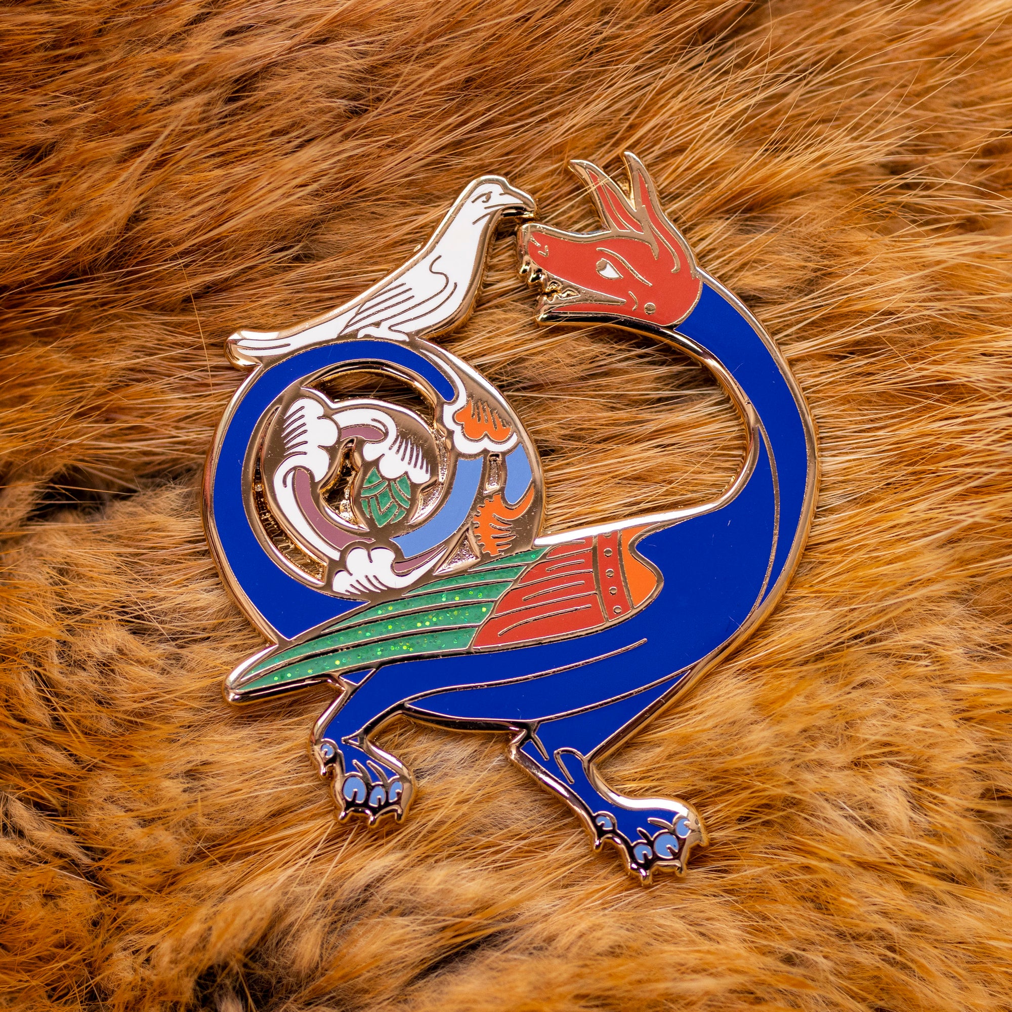 This pin depicts a dragon and a dove, from the illumination of the Perindens Tree in the Aberdeen Bestiary.