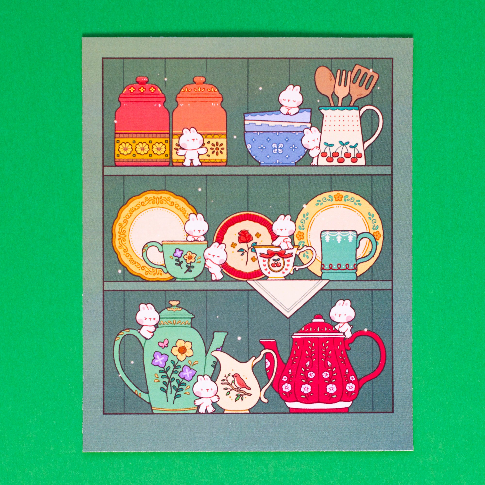 A cabinet filled with precious heirloom. Original print by Nekomori Art.