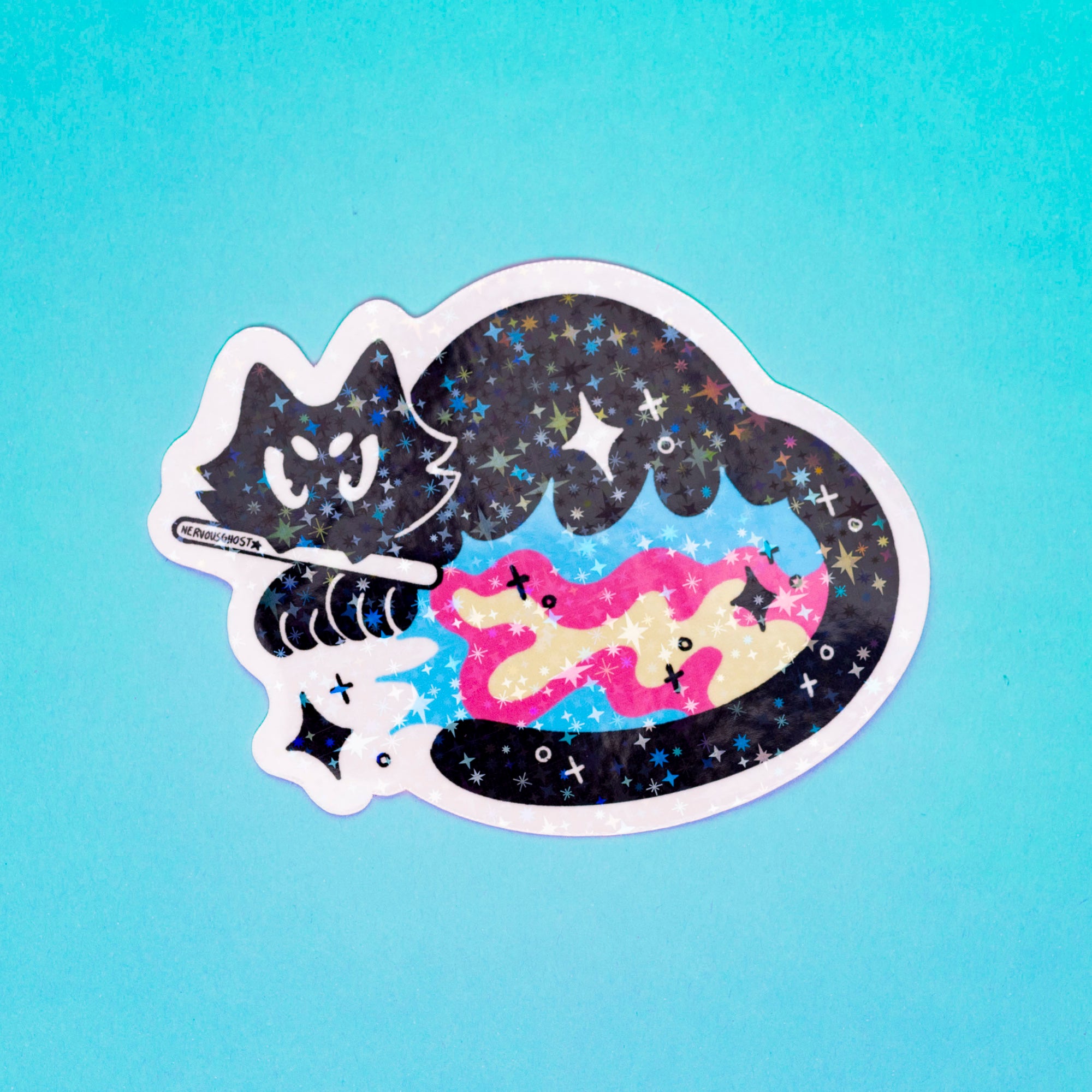 Vinyl sticker - Progress Pride cat has a holographic finish to emphasise the magic of being queer!