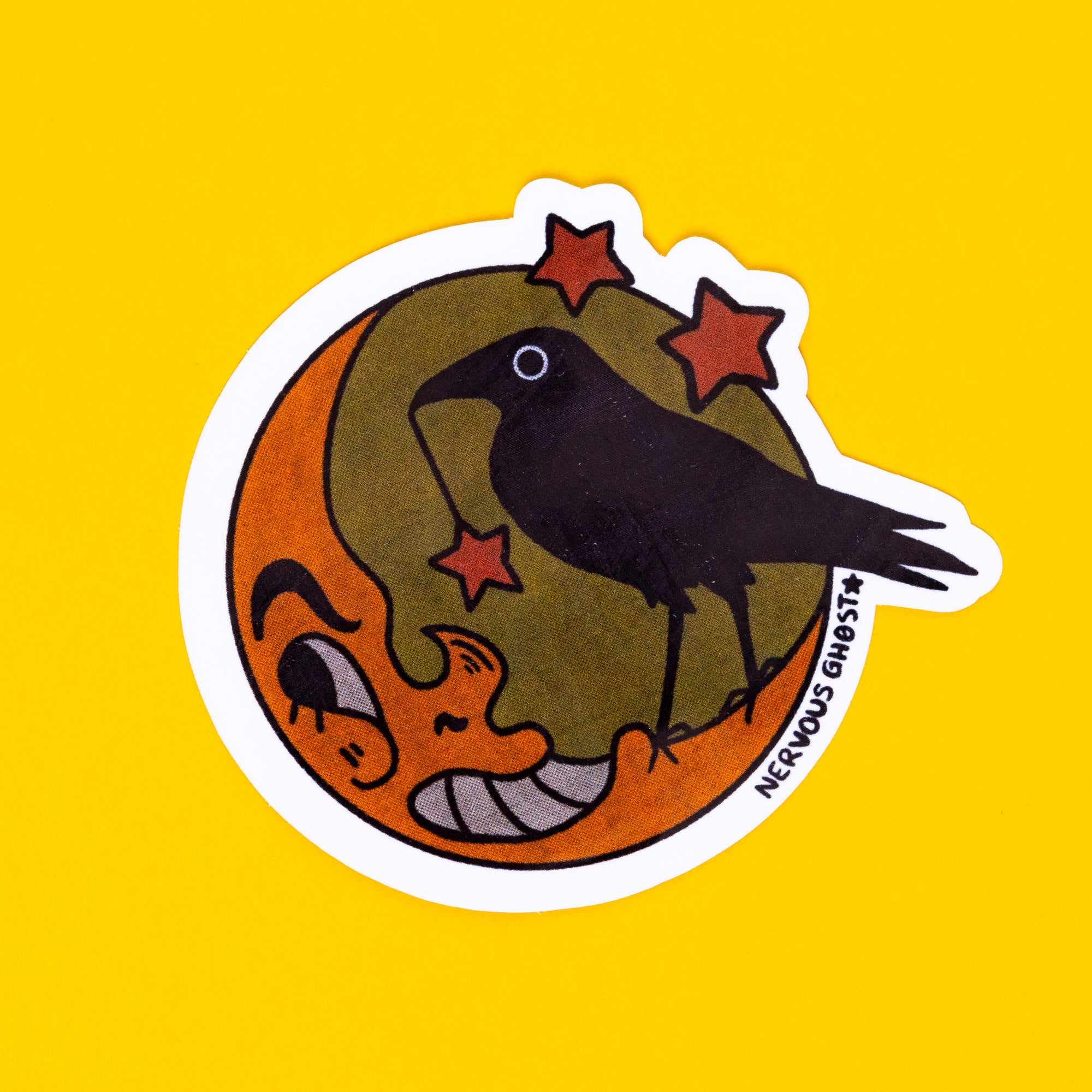 Vinyl sticker - Raven holding a star, perched on top of a cheeky looking moon