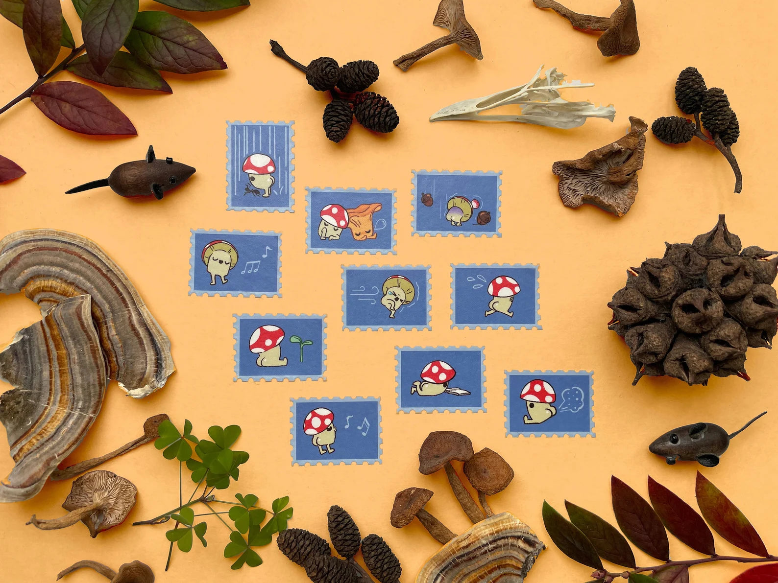 Stamp washi tape featuring Buttshroom designs! Order is for 1 roll of stamp washi tape; adhesive is on quick-release paper, gentle on surfaces, and perfect for crafting/decorating! 24 x 35 mm per stamp 5 m total length