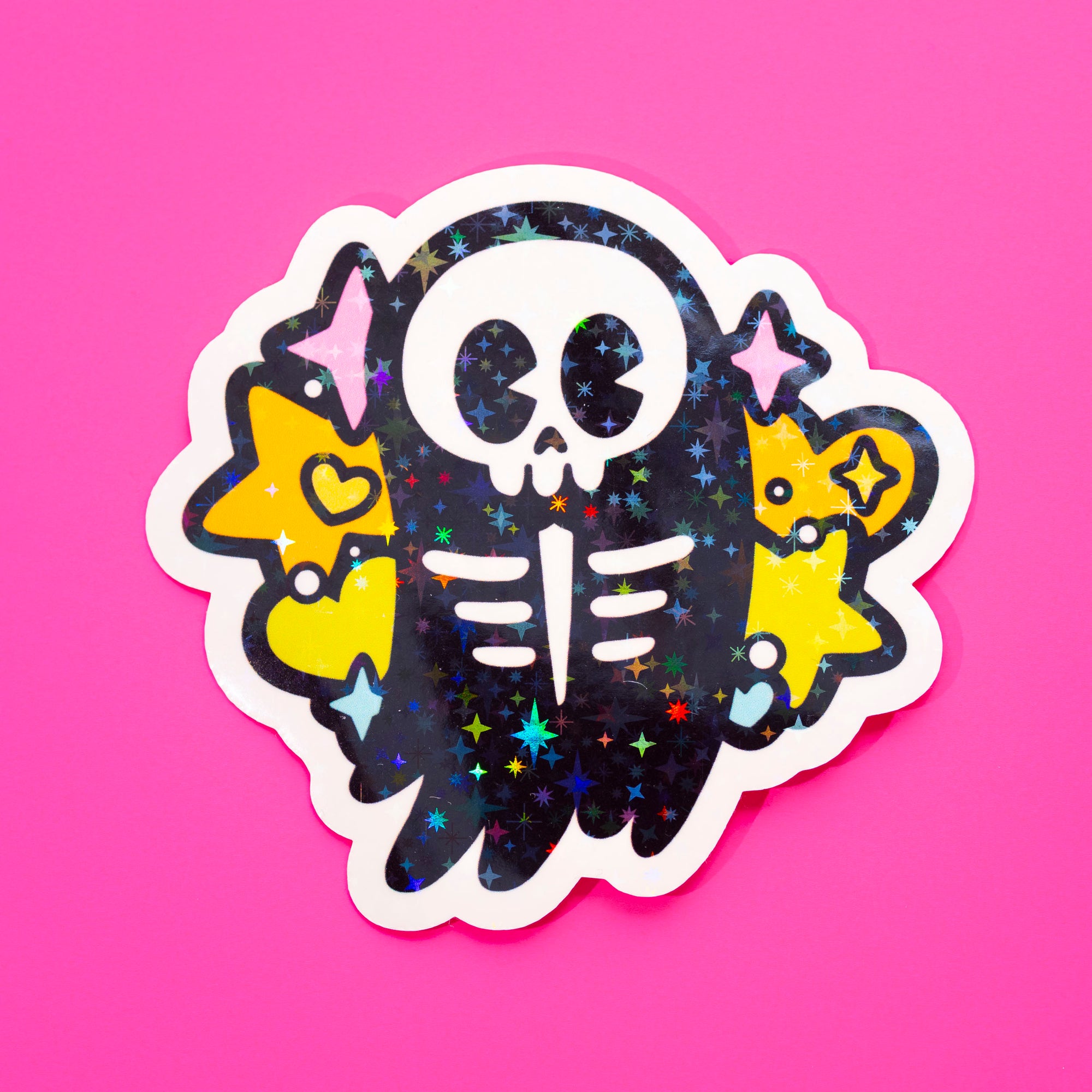 Struck by the Chromatic Curse, Sparkle is just a friendly little skeleton-ghost looking to be your friend. Featuring holographic sparkle finish for that extra bit of spooky magic!