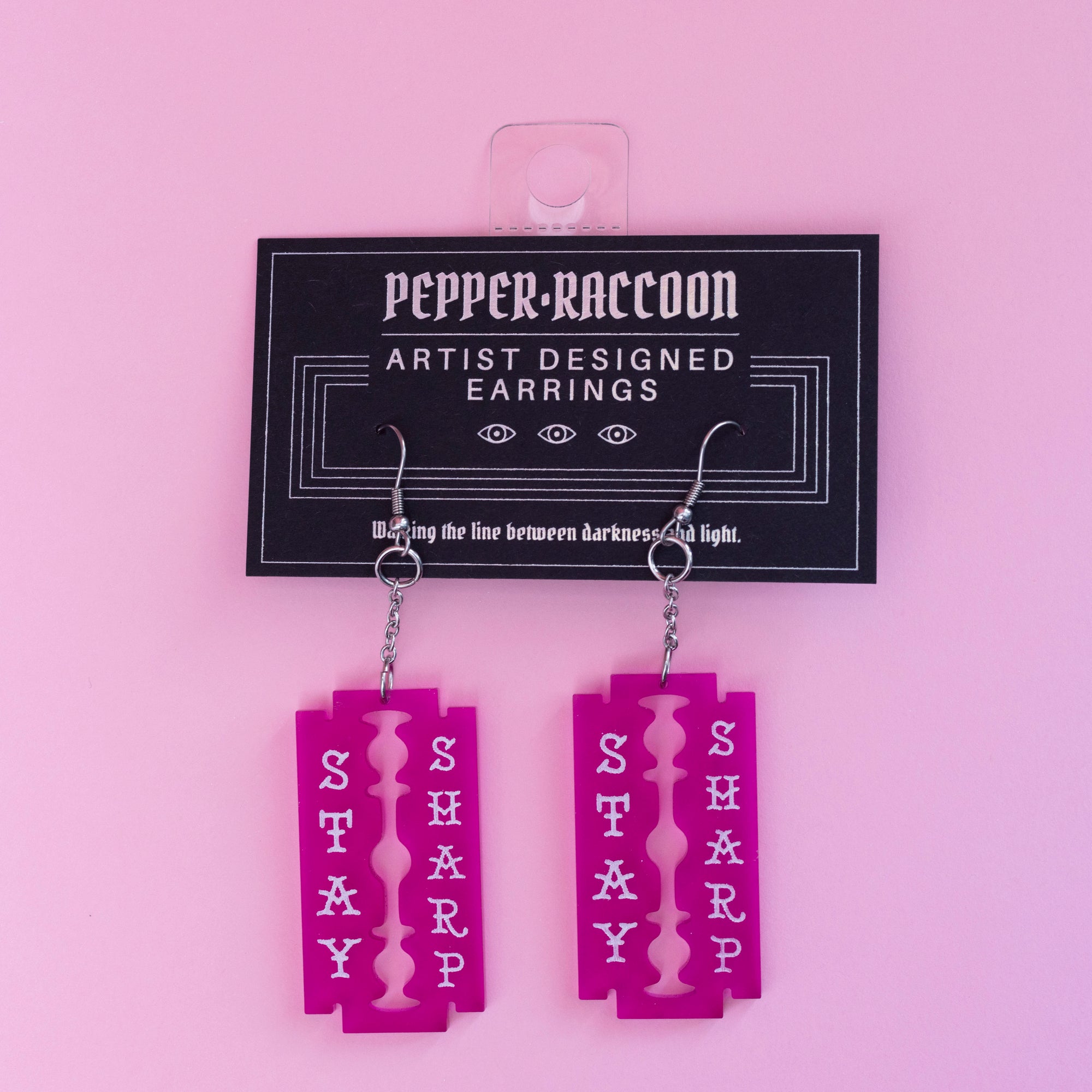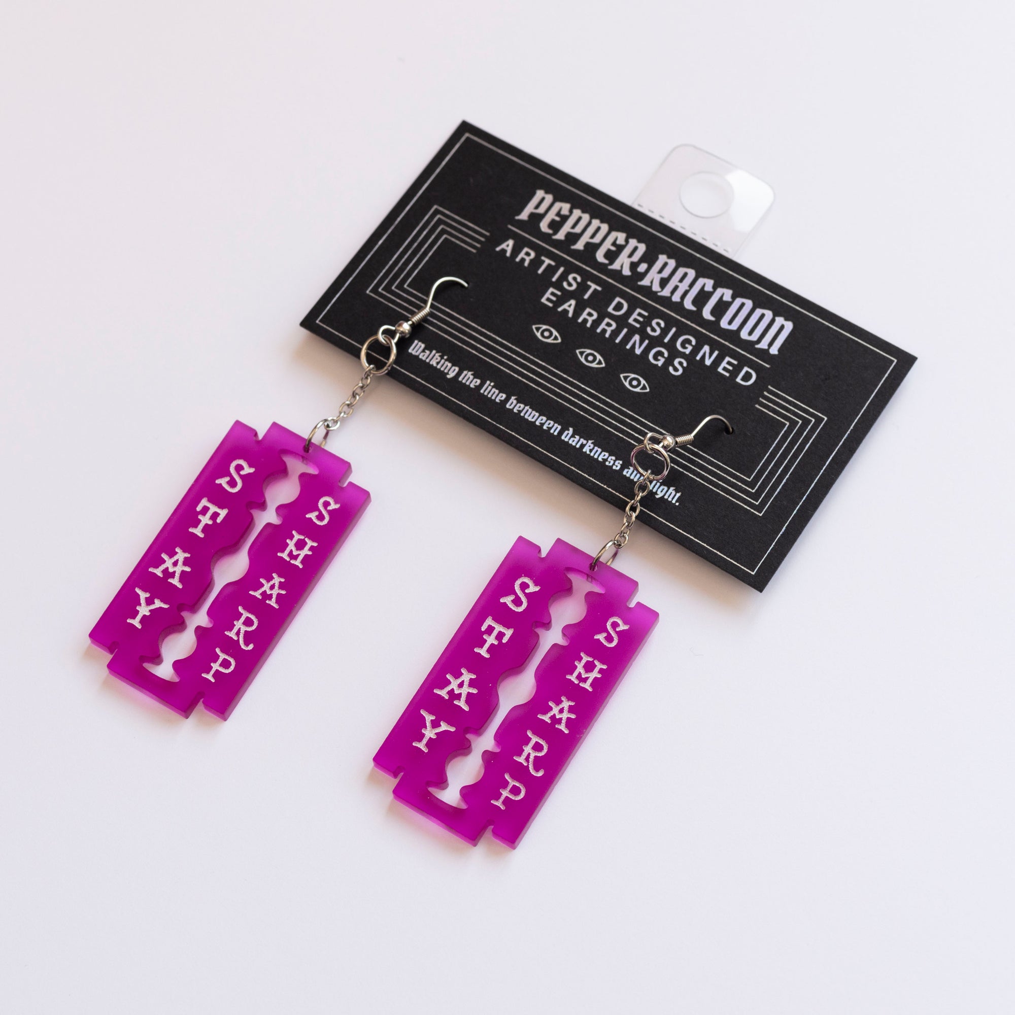 Get the edge with these satin-soft, razor sharp (not really) fushcia acrylic earrings.