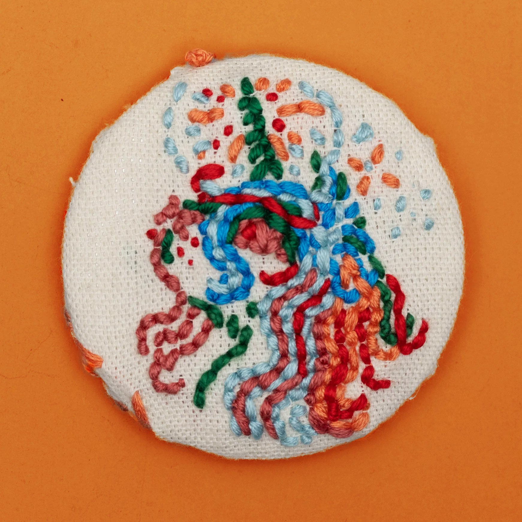 Basic calico fabric, coloured embroidary thread, metal circular pin backing