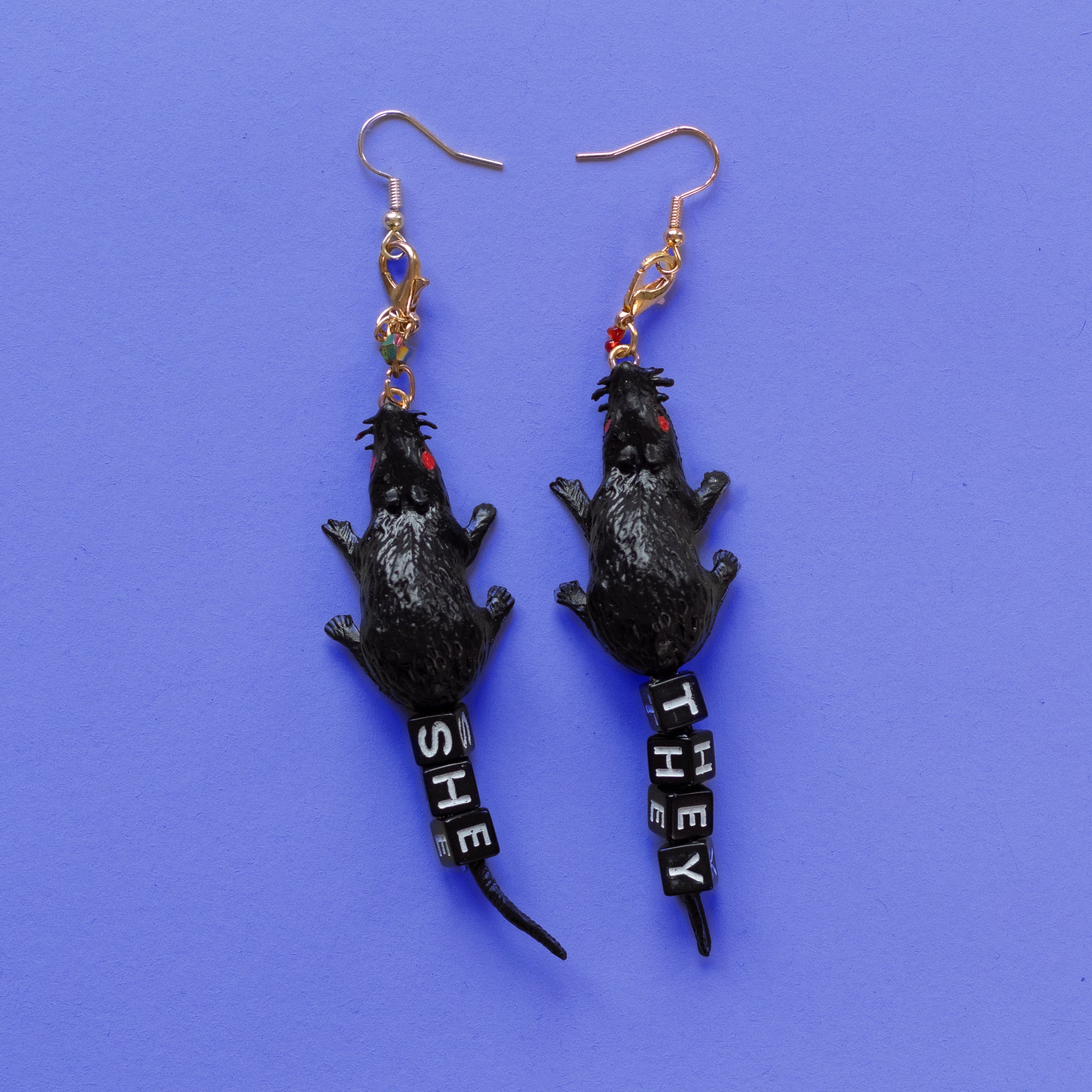 A delicate pair of rats showcasing she/they pronouns, simple beading and gold metal chains. This pair is attached to lobster claw necklace clasps and so can be attached to anything the wearer desires.