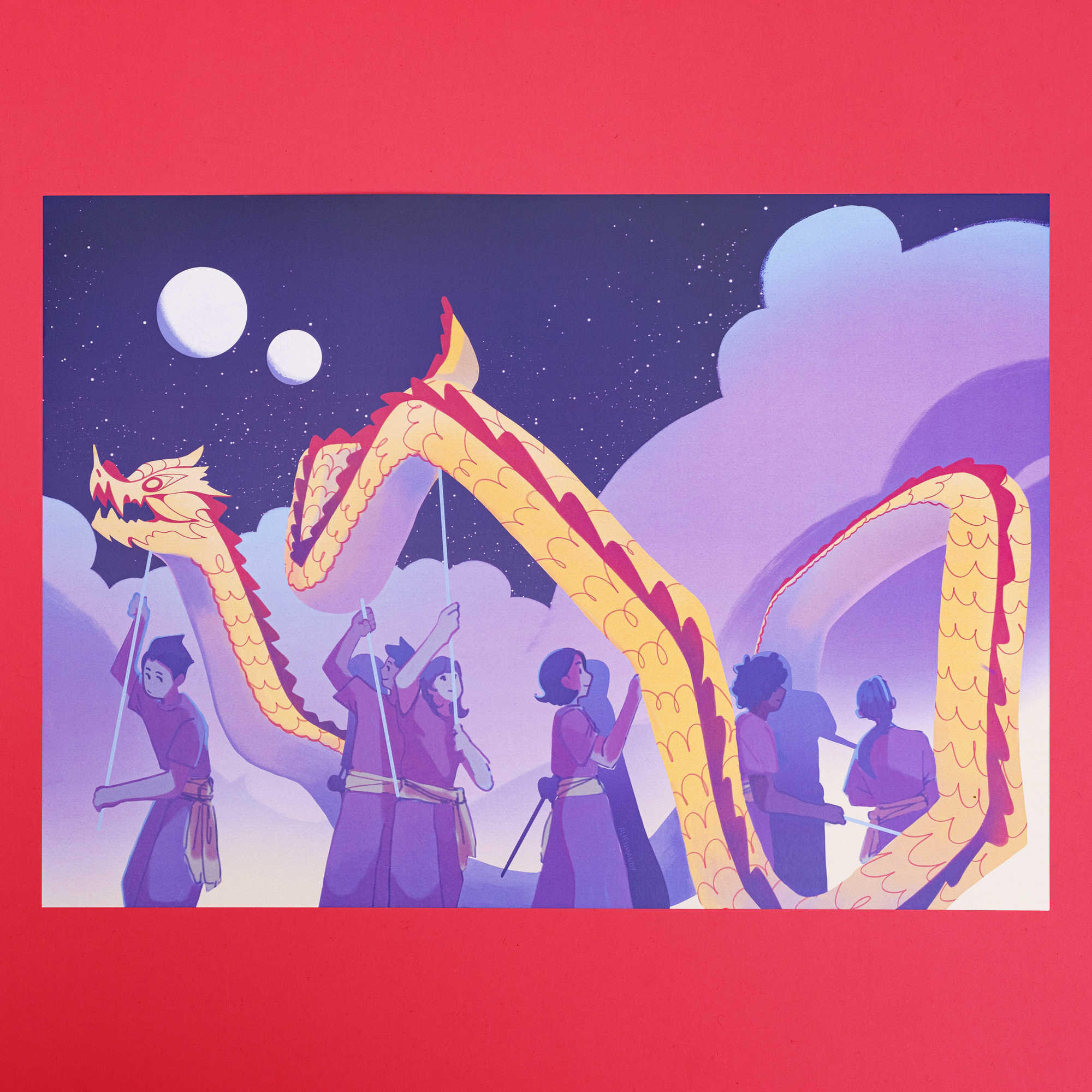 This original illustrated print by ALIENMANDY depicts a group of dragon dancers performing under the moonlight. The artwork is printed in two sizes on high-quality 200gsm satin print stock, giving it a luxurious and vibrant finish. The intricate details and rich colors of the dragon dancers come to life on the page, making this print a true work of art. Whether you hang it on your wall or give it as a gift, this print is sure to impress and delight.