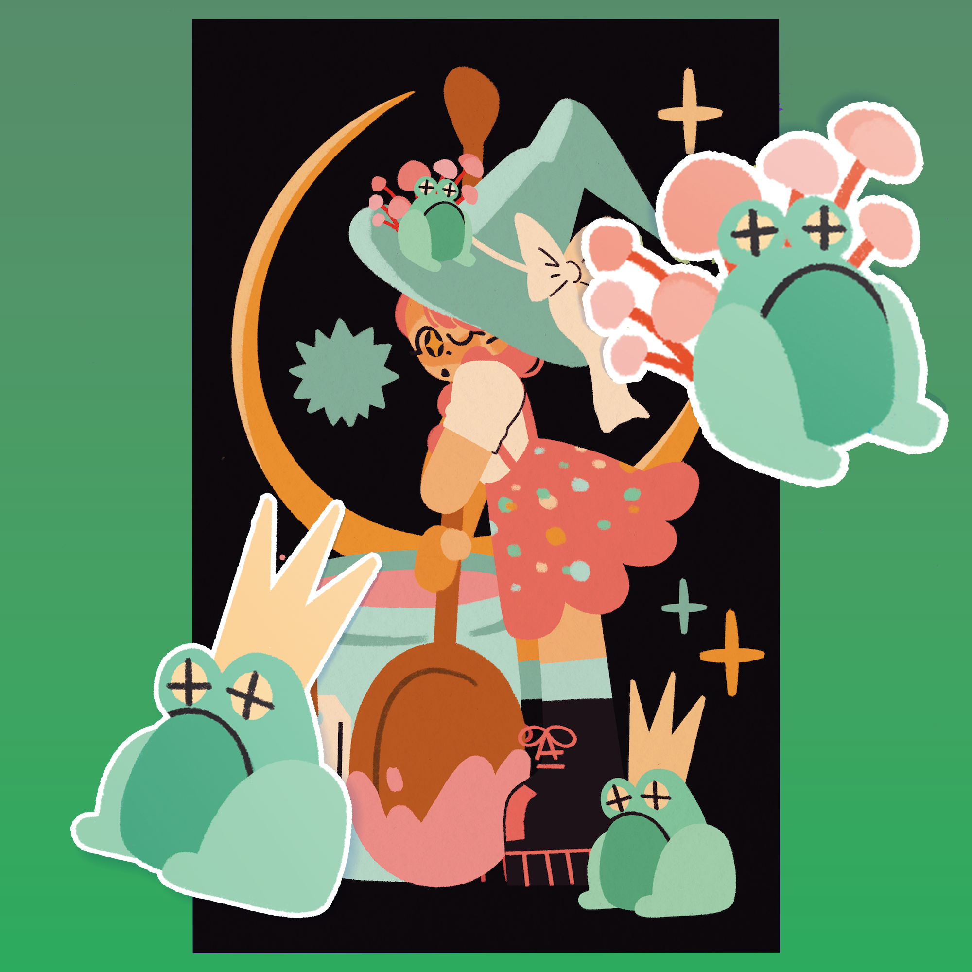 For the real frog fans. This pack contains 1 Sugar Witch Print, 1 King Frog Sticker, and 1 Mushroom Frog Sticker. Original art by Shadeyart.