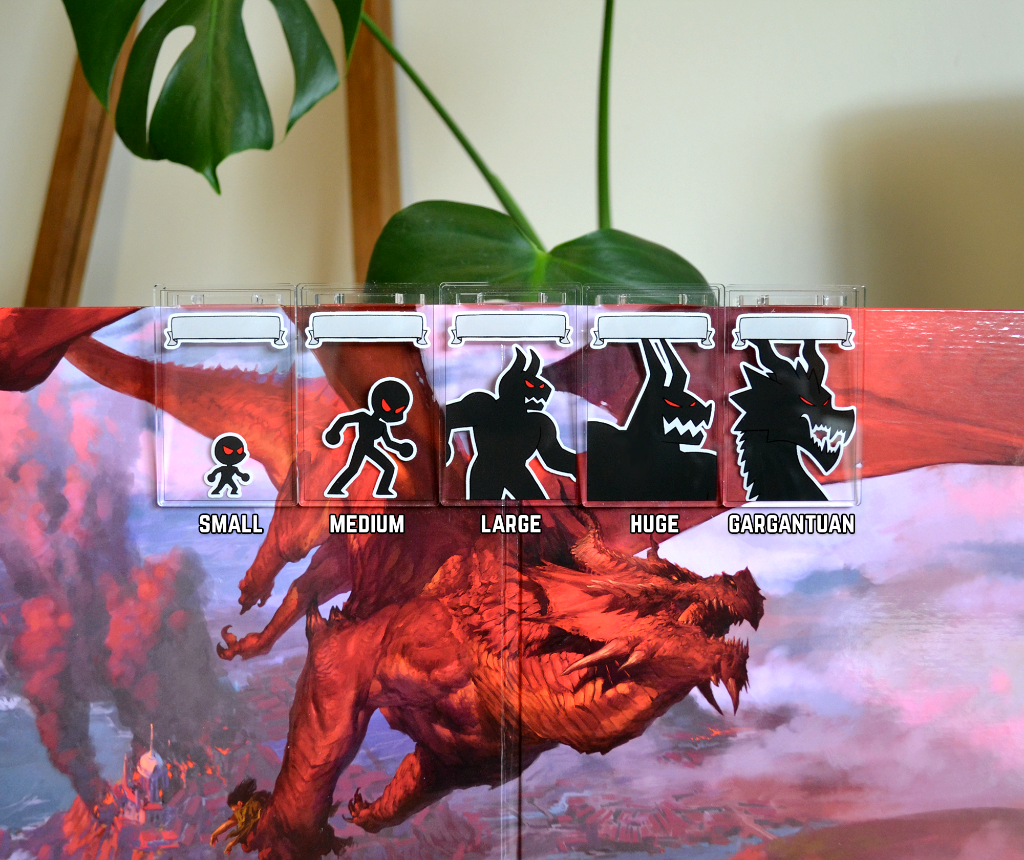 From left to right in the first product photo, the enemy initiative markers are: Small, Medium, Large, Huge, and Gargantuan. The creature sizes to choose from are based on standard D&D creature sizes, matching the enemy token sizes and artwork.