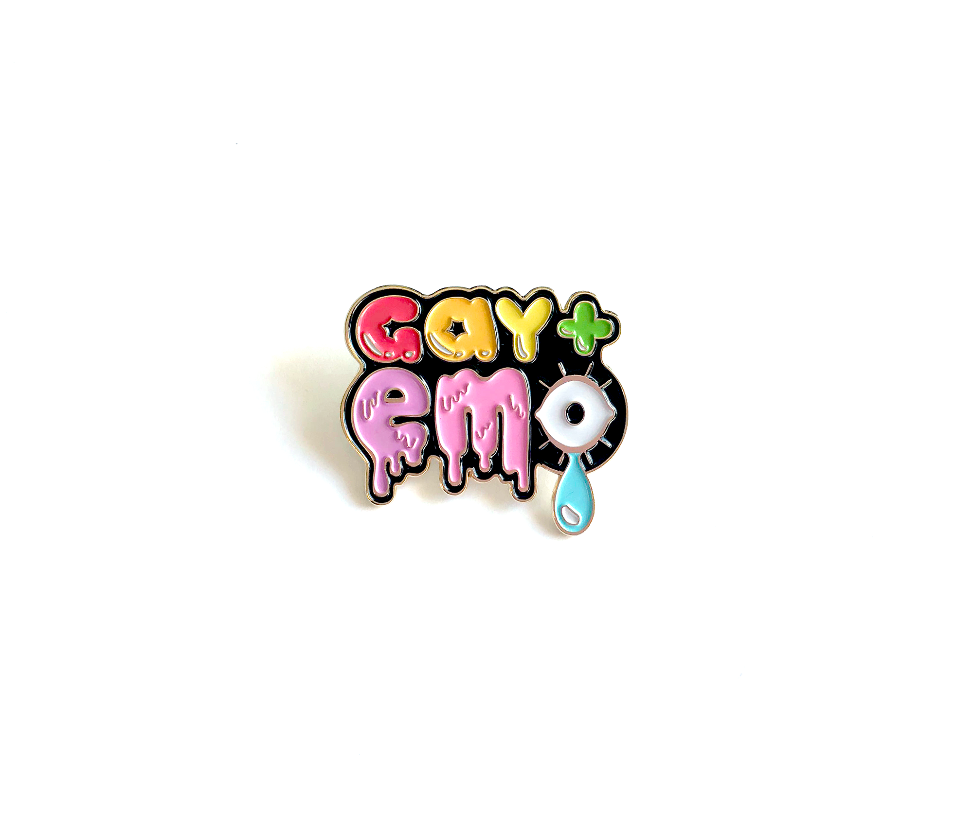 A 4cm gold-plated soft enamel pin of the words "gay+emo" in rainbow bubble and melt font, with a crying eye design in place of the 'o'.