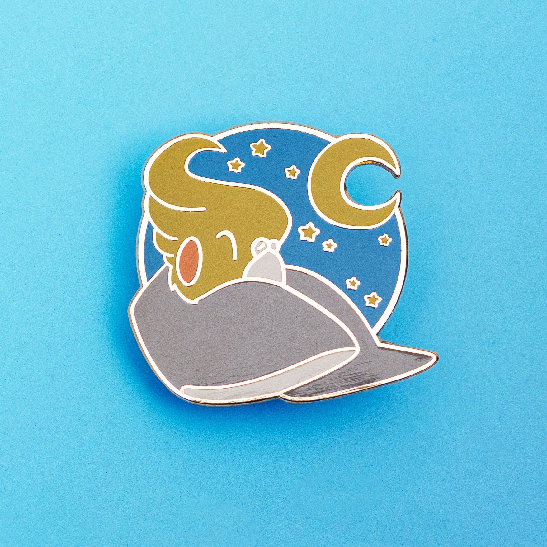 A hard enamel pin featuring a small sleepy cockatiel, getting a good night's rest.