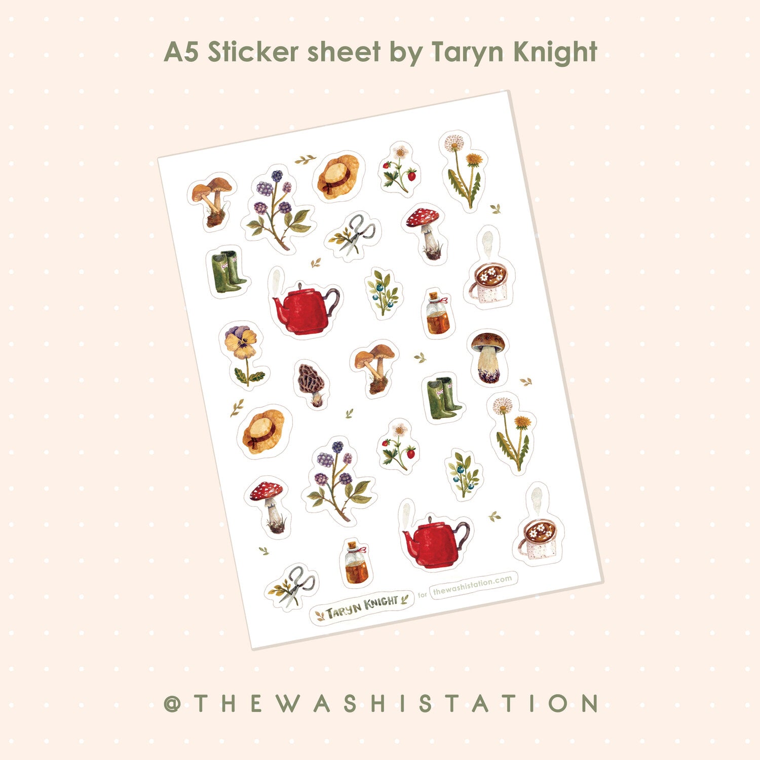 A5 size sheet (roughly half the size of a standard piece of letter paper) featuring 27 stickers! Most designs appear twice, so you can use them, keep them, or cut em up to share with friends! Printed on washi paper, stickers are slightly transparent.