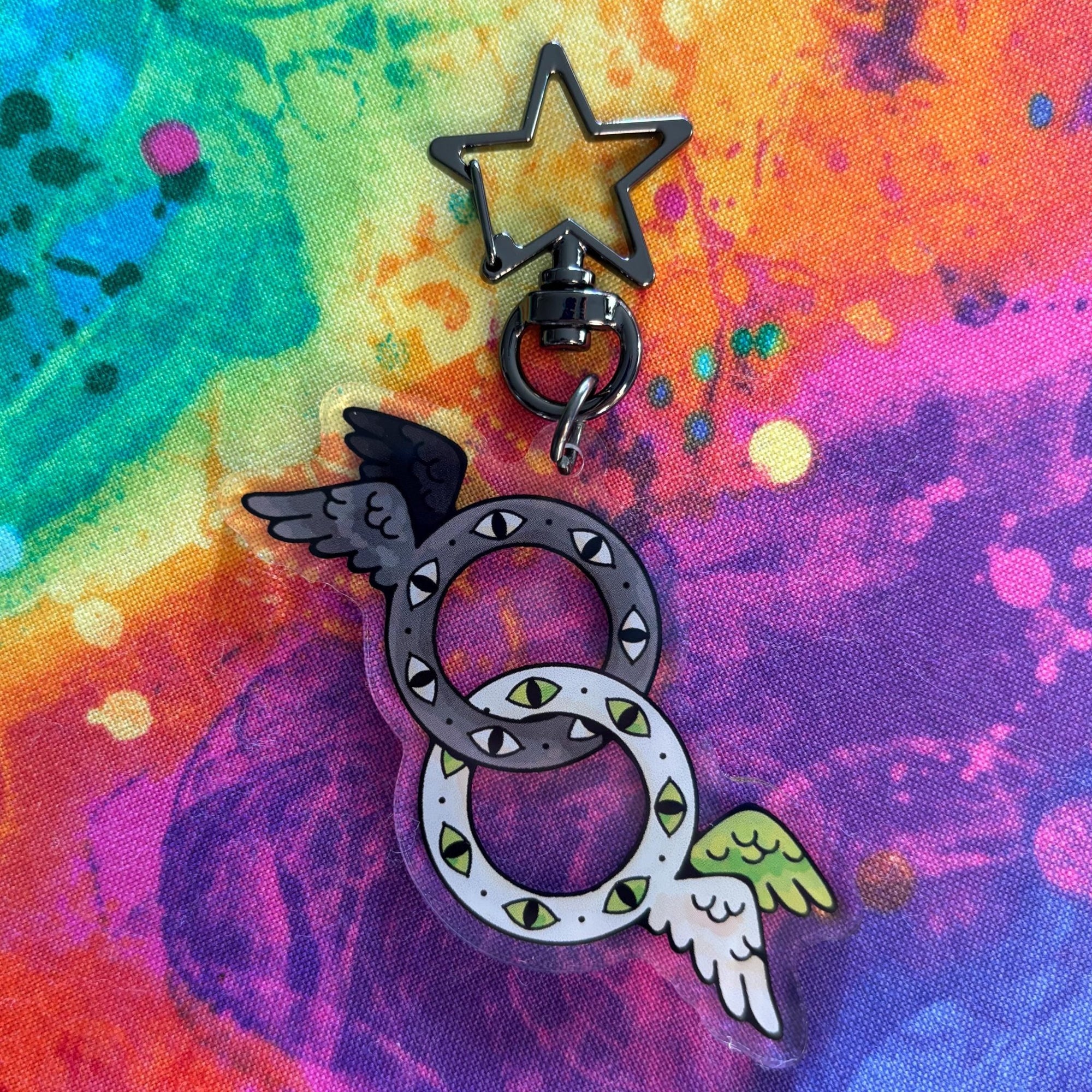 | This acrylic keychain is 2.5 inches (6.3 cm) on the longest side, double-sided with the same print on both sides; it has a gun metal star clasp. |