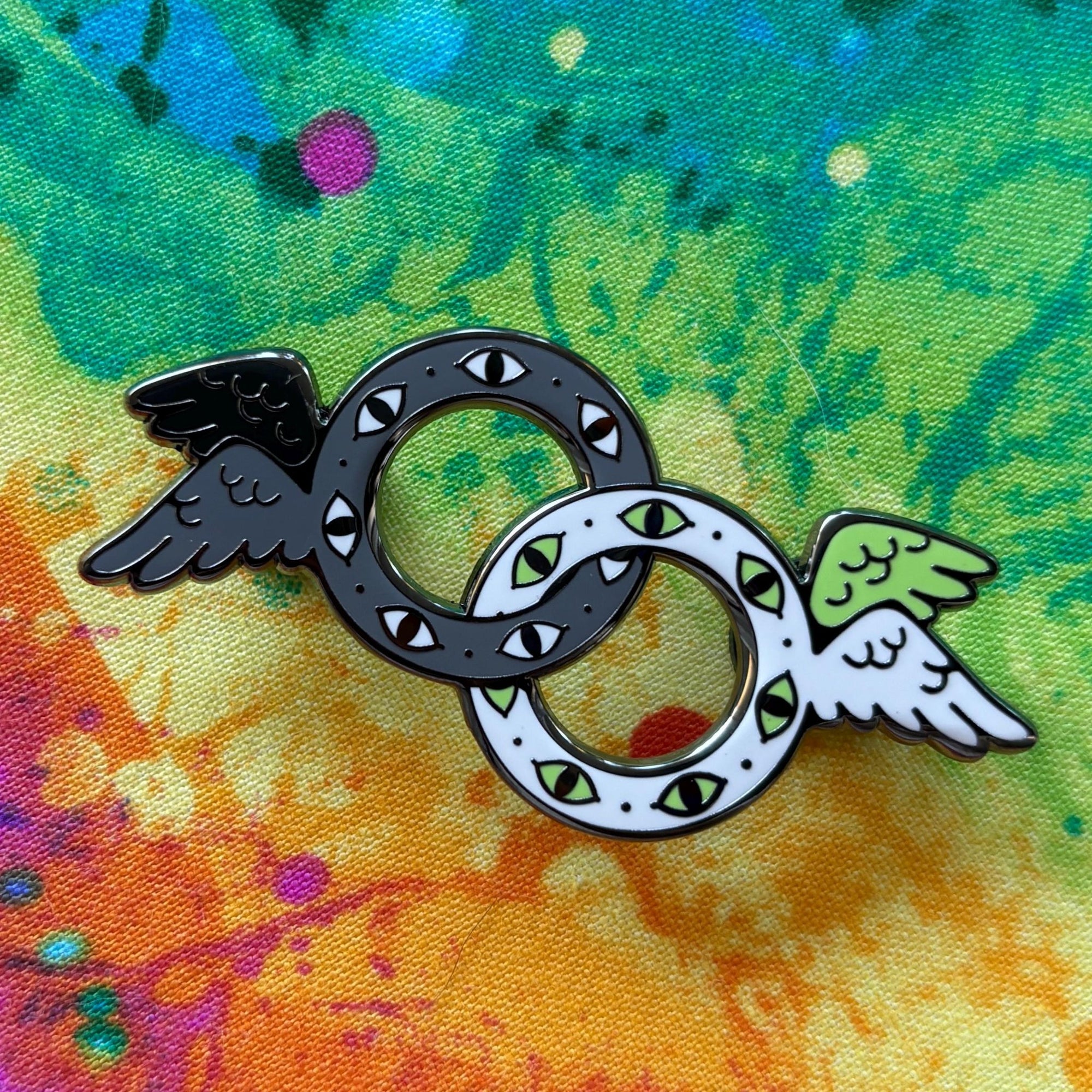 This pin has hard enamel, two pin posts, and rubber backings. It is 2 inches wide with black nickel plating.