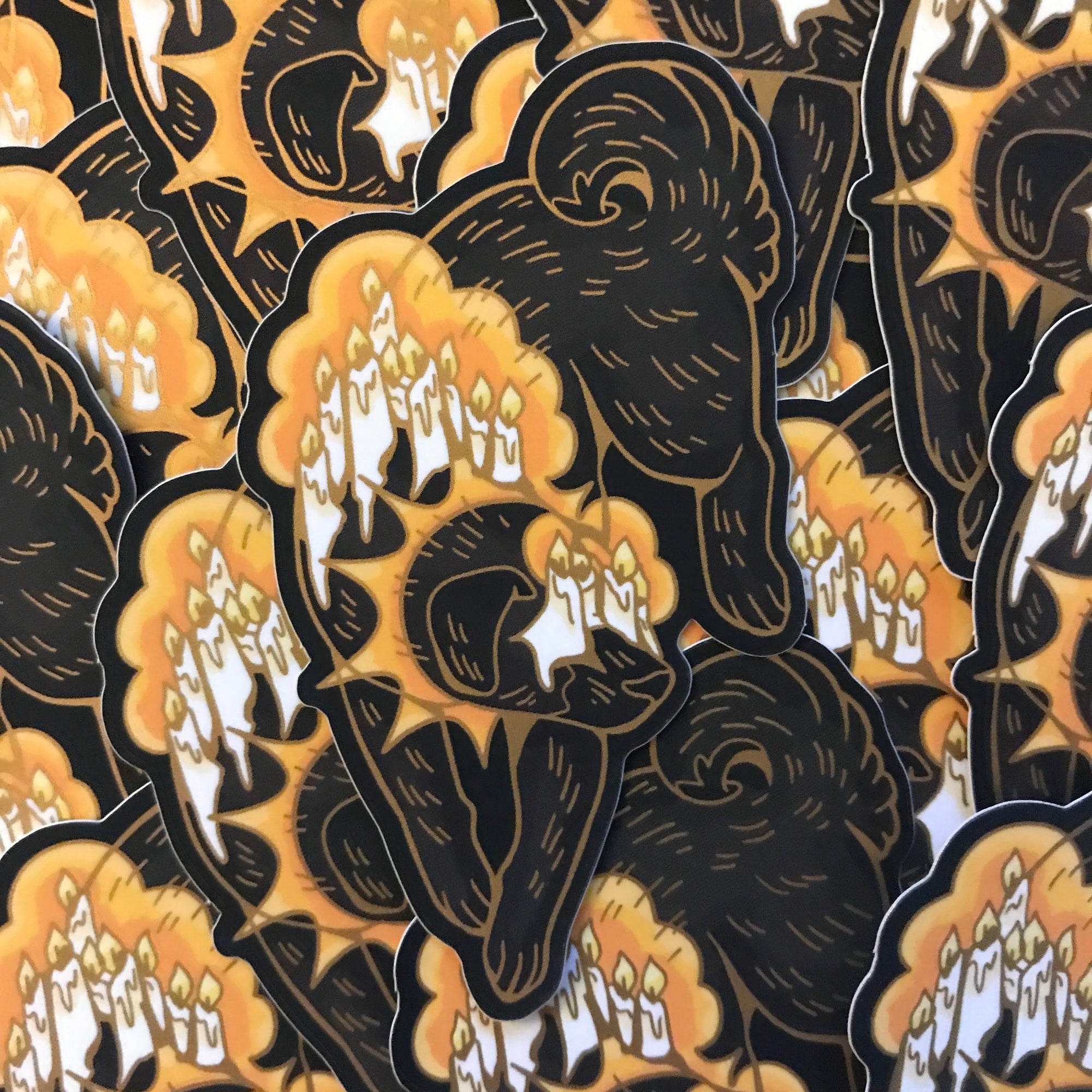 An angelic graveyard guardian, with a protective collar halo. This sticker is approximately 3 inches (7.6 cm) on the longest side. It has gold foil linework and a matte finish.