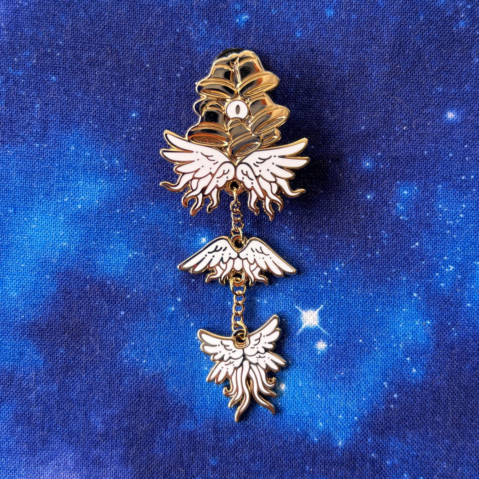 | This pin consists of three parts connected by chain, and is about 3 inches (7.6 cm) long. It has gold plating and hard enamel. The top component has two pin posts with rubber backings. This listing is for standard grade pins only. Standard grade pins may have one or two tiny imperfections. |