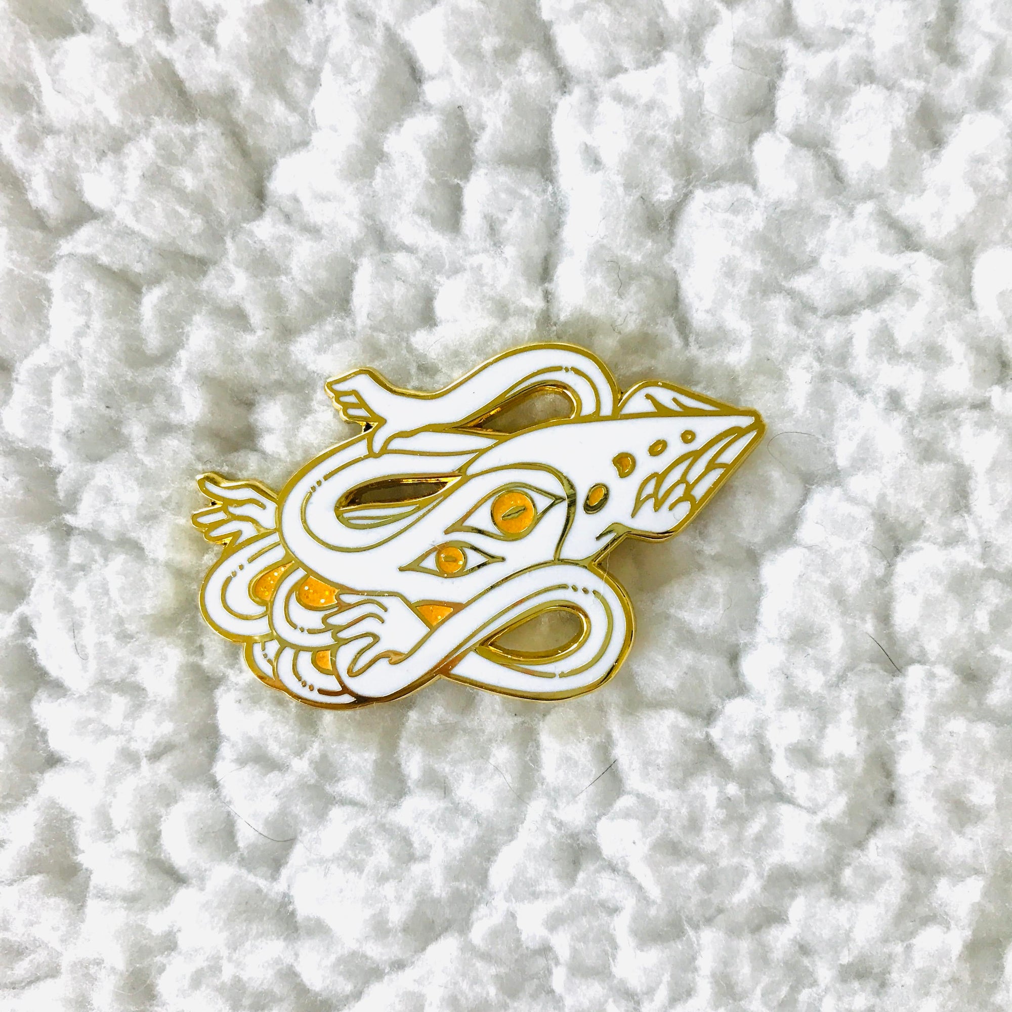 The pin is 1.7 inches (4.6 cm) long. It has two pinbacks with rubber clutches, hard enamel with glitter accents, and gold plating.