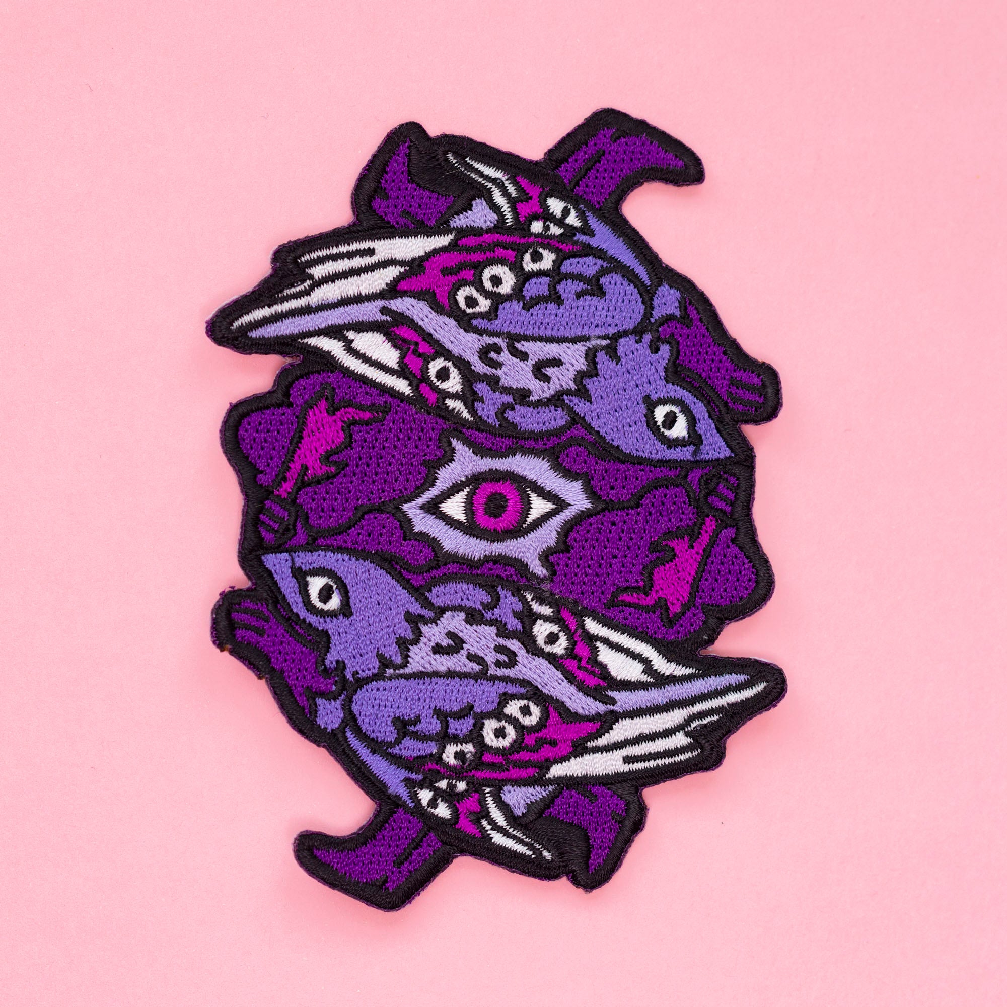 A pair of sword-wielding pigeon angels, for Asexual pride.The patch is 4 inches (10 cm) on the longest side, embroidered with an iron-on backing. The backing should last for 25 washes. I recommend putting a few stitches in so you don’t lose the patch.