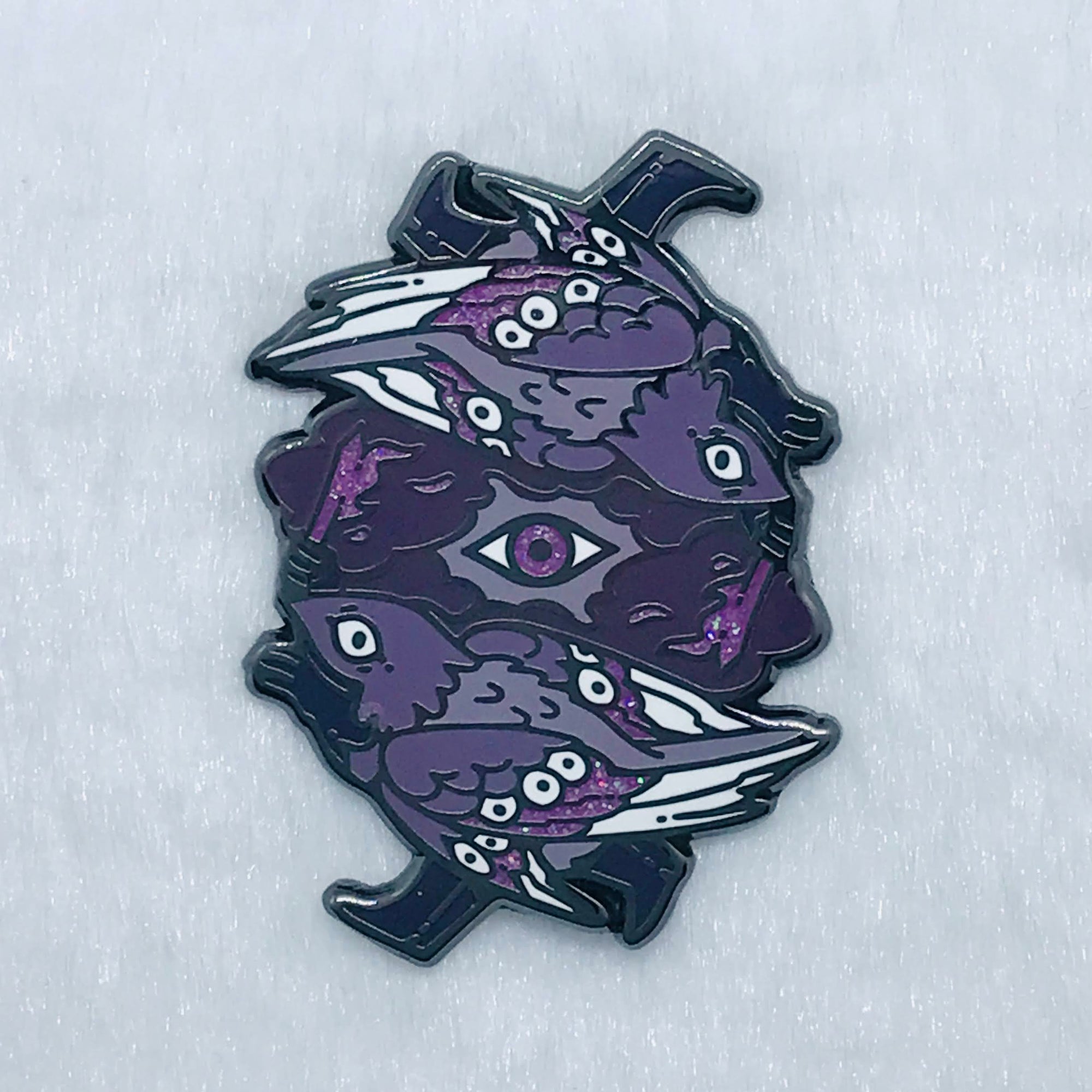 This pin is approximately 2 in (4.6 cm) long. The pin has hard enamel with glitter accents, black nickel plating, and two pin posts with rubber clutches.