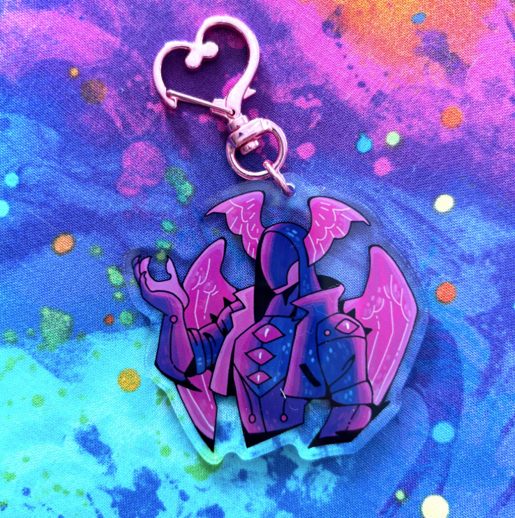 | This acrylic keychain is 2.5 inches (6.3 cm) on the longest side, double-sided with the same print on both sides; it has a pink heart clasp. |